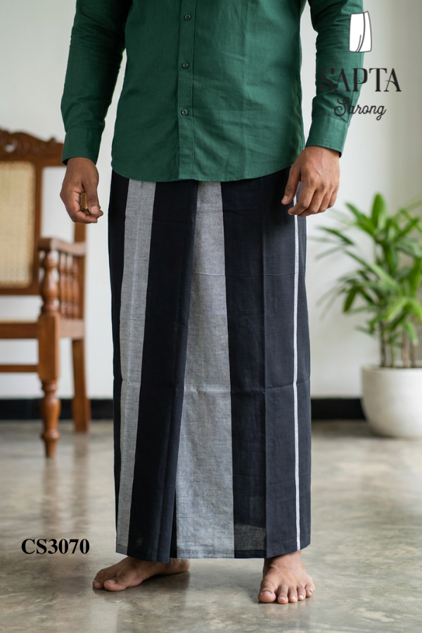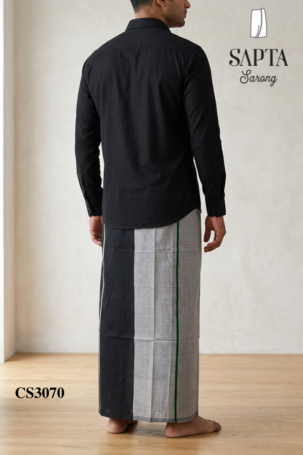 Meet the Men\’s Black Gray Pinstripe SAPTA Sarong CS3070—a modern wrap lungi that elevates everyday comfort with effortless polish. A striking solid black front panel is framed by two vertical pinstripe sections—sleek black with fine grren on one side, and a denser gray pinstripe on the other—finished with a subtle contrasting border and an inner gray fold for a refined, balanced look. Versatile by design, this vertical pinstripe sarong for men moves from home to street to ceremony with ease; style it with a crisp shirt or a relaxed tee for instant sophistication. Order the Black Panel Striped SAPTA Sarong CS3070 now—buy men\’s black gray sarong excellence in a single, refined wrap lungi and claim your signature striped sarong for men.