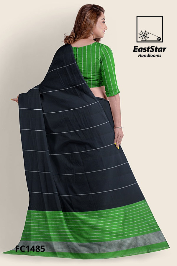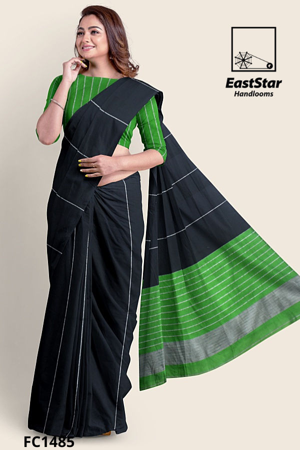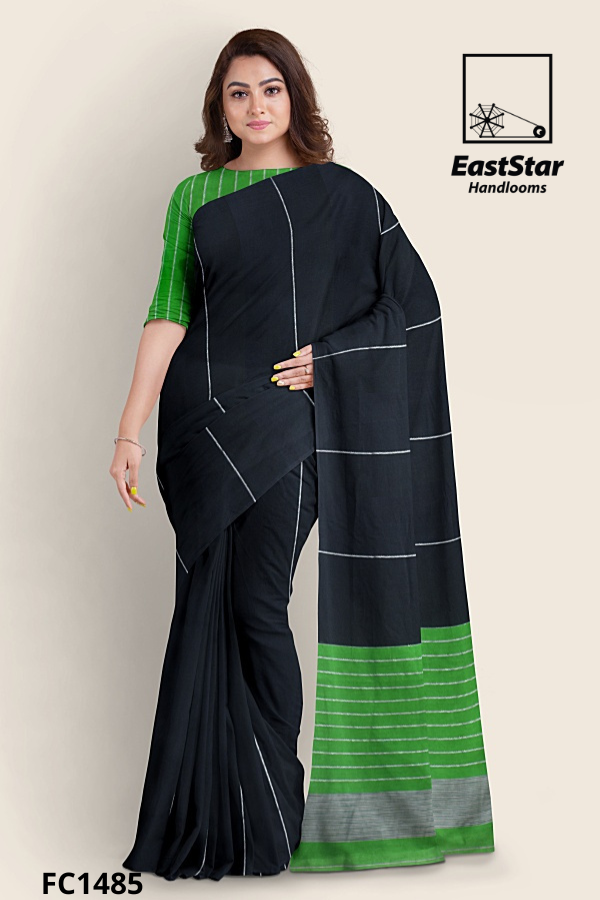 Discover effortless elegance with the Black pinstripe saree EastStar Handlooms FC1485—a minimalist striped saree with pallu that balances timeless grace and modern edge. Meticulously handwoven, this Green pallu saree EastStar Handlooms pairs crisp white pinstripes on deep black with a statement pallu: a broad emerald section with fine horizontal stripes and a subtle gray band, delivering a standout handloom black striped saree design. Lightweight, versatile, and flattering, this black pinstripe saree green pallu pairing moves from boardroom to celebrations—let the black pinstripe saree pallu do the talking with sleek jewelry and heels. Buy black pinstripe saree online and order green pallu striped saree from EastStar Handlooms today.