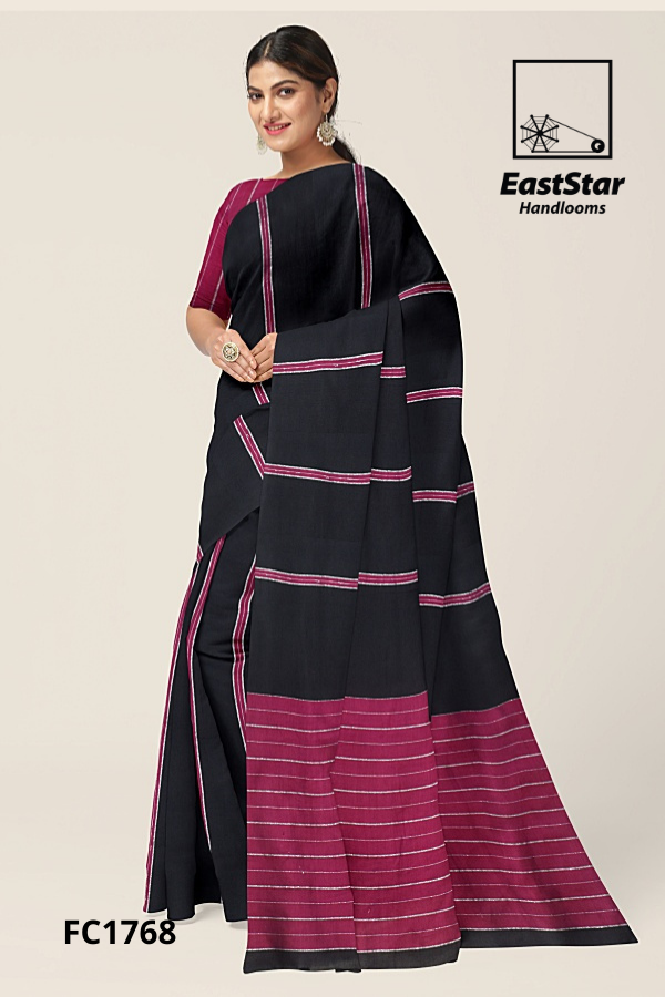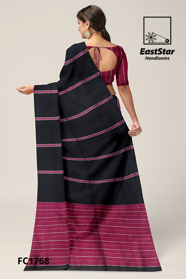 Introducing EastStar Handlooms FC1768, a matte black handloom saree with a bold magenta border designed to make every entrance unforgettable. Draped in classic Nivi style, the body features spaced horizontal magenta stripes edged with fine light lines, while the striped pallu showcases a wide magenta panel with many narrow white stripes and a sleek black edging. Refined, versatile, and undeniably elegant, this black handloom striped saree elevates festive nights and boardroom days with effortless polish. Order matte black handloom saree FC1768 from EastStar Handlooms today — buy black handloom striped saree and buy black saree magenta border in one timeless piece, your perfect striped pallu black handloom saree.