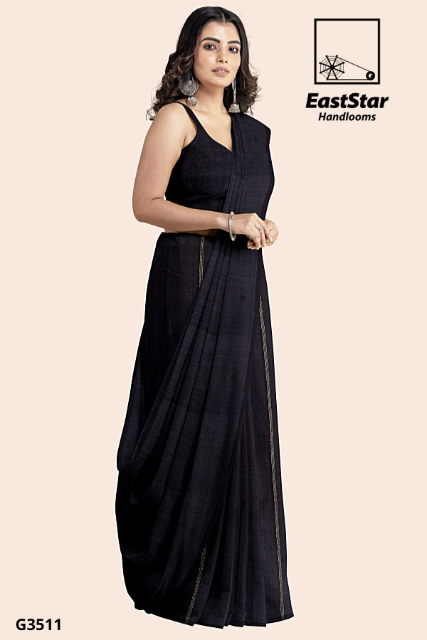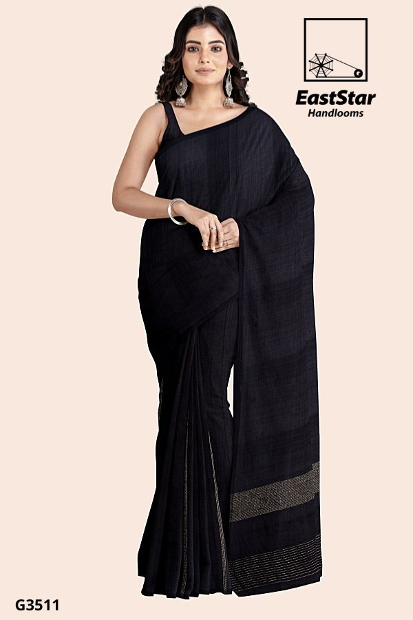 Step into elegance and grace with our Elegant Black Saree, designed to make every occasion special. This classic saree features subtle horizontal patterns, beautifully complementing its minimalist aesthetic. The thin gold border adds a touch of regal sophistication, making it perfect for any party or formal gathering. Artfully draped, this saree promises to enhance your style quotient with effortless charm. Pair it with statement earrings and a bangle to complete your look. Discover the allure of this classy Black Party Saree, a perfect addition to your wardrobe for when you want to make a statement in understated elegance. Order now and let this timeless piece be your go-to for those unforgettable events.