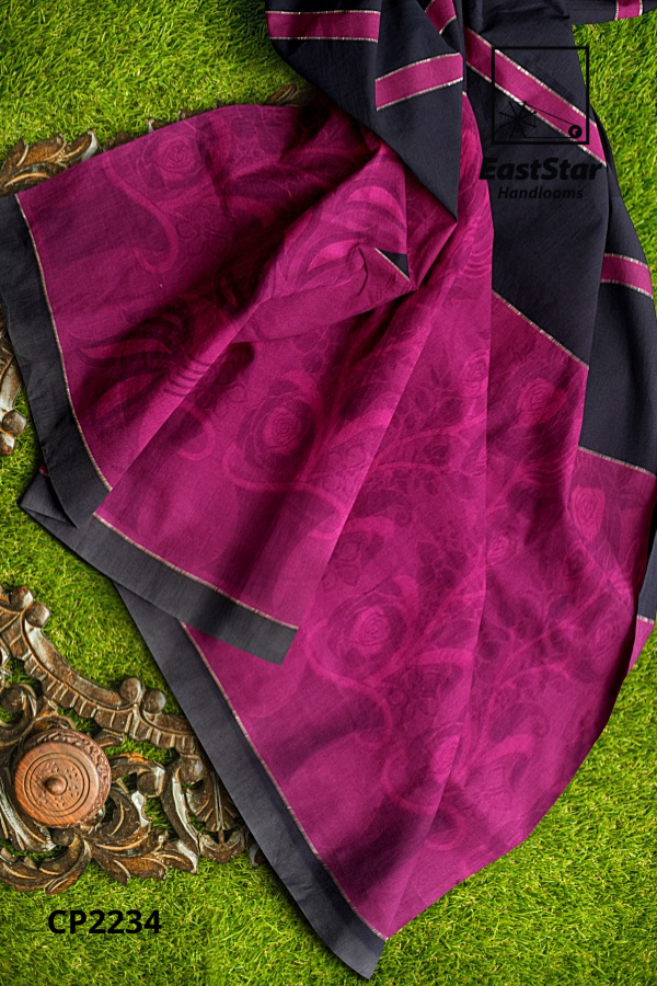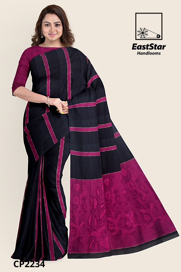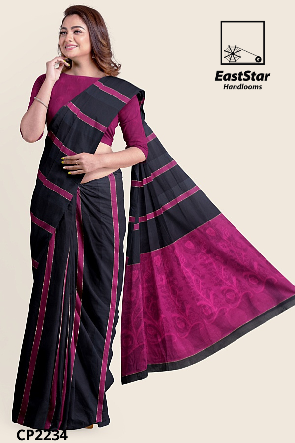 Meet CP2234 from EastStar Handlooms, a black magenta striped handloom saree that channels modern drama with timeless craft. Handloom-woven in deep black with sleek magenta stripes edged in subtle metallic accents, it pairs with a solid magenta blouse featuring a high, wide neckline and elegant elbow-length sleeves. This metallic accent black pallu saree features alternating black bands with magenta horizontal stripes and culminates in a wide magenta, tone-on-tone floral border with a neat black edging—refined, festive, and irresistibly photogenic. Choose this metallic border party saree for evening soirees or weddings—your perfect floral border magenta pallu saree; buy the Black magenta striped saree EastStar Handlooms CP2234 today and order this handloom striped pallu saree to elevate every celebration.