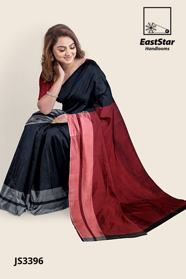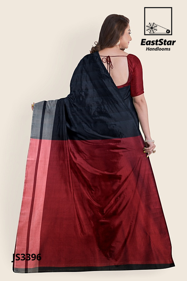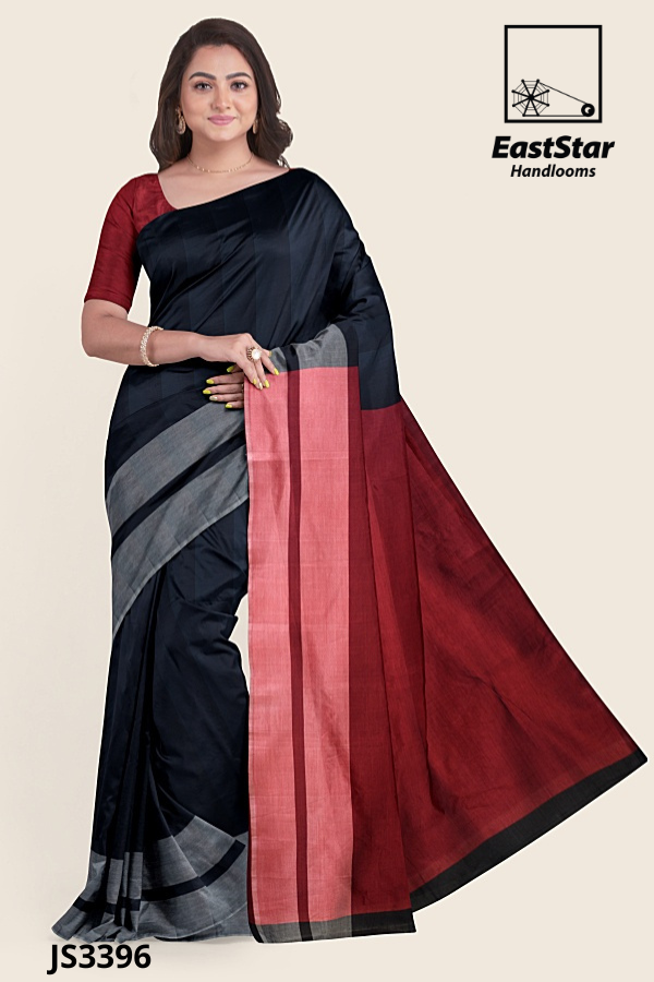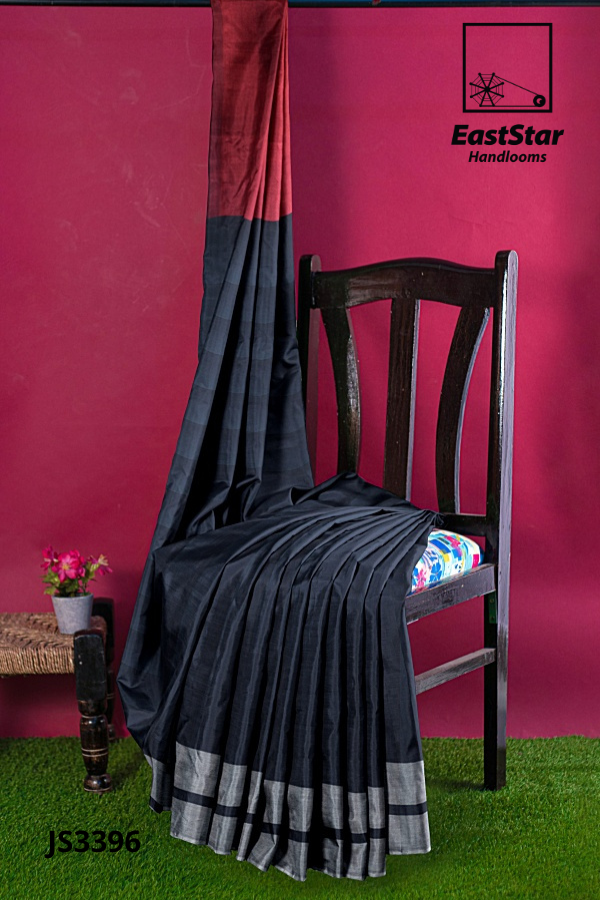 Meet EastStar Handlooms JS3396, a soft sheen black handloom saree defined by wide grey borders and elegant diagonal bands that sculpt graceful pleats. Its rich maroon pallu with rose-pink stripes and a sleek black outer border delivers a striking finish—an elevated maroon pallu grey border EastStar Handlooms saree for celebrations and chic evenings. Handwoven for fluid drape, comfort, and timeless polish, this black handloom saree with maroon pallu pairs effortlessly with your favorite blouses and jewelry. Buy this black handloom saree with maroon pallu now – Order this grey border handloom saree from EastStar Handlooms to secure JS3396, the black handloom saree with grey border you will reach for again and again.