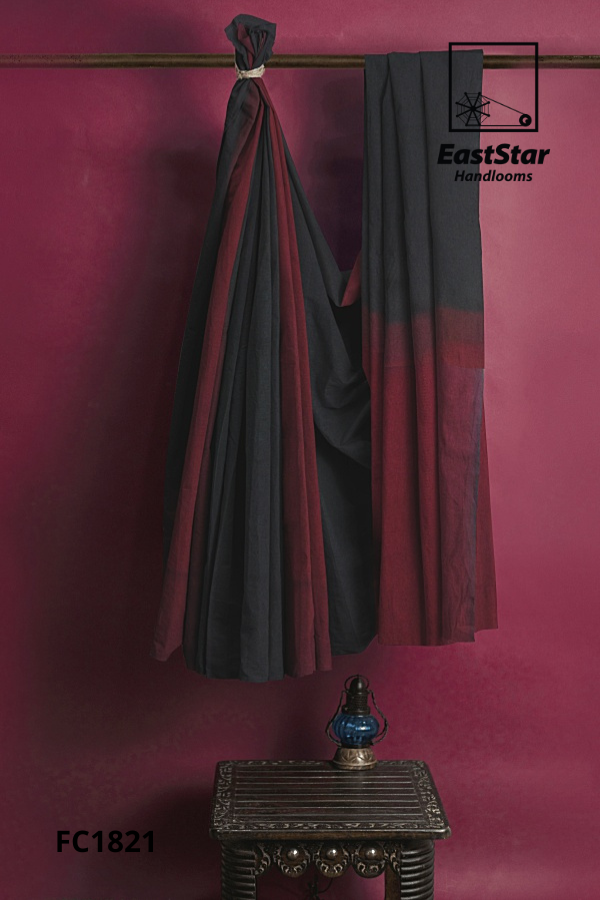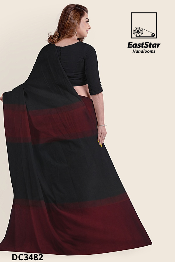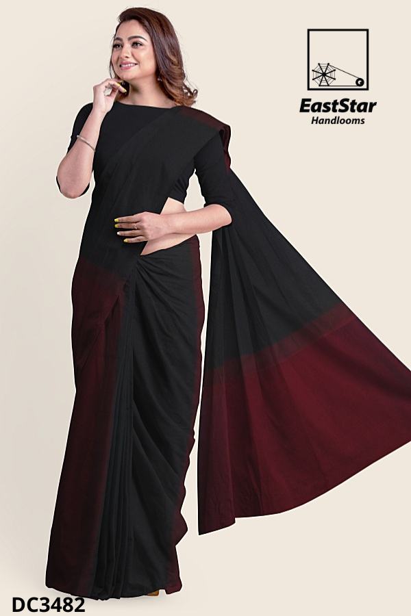 Elevate every occasion with the EastStar Handlooms Elegant Plain Black Saree, code DC3482—a black burgundy gradient handloom saree that drapes in soft pleats and finishes with a luxurious pallu. The predominantly black weave is refined by a deep maroon band along the lower drape and pallu, styled with a fitted black blouse and boat neckline for effortless poise. A Black maroon gradient saree EastStar Handlooms signature, this Handloom black saree EastStar Handlooms favorite is a plain elegant black saree that moves from boardroom to celebration with quiet power. Buy black maroon gradient saree now—Order plain elegant black saree and Buy handloom black maroon saree to add a versatile, soft pleated elegant black saree and plain black saree with pallu to your wardrobe.