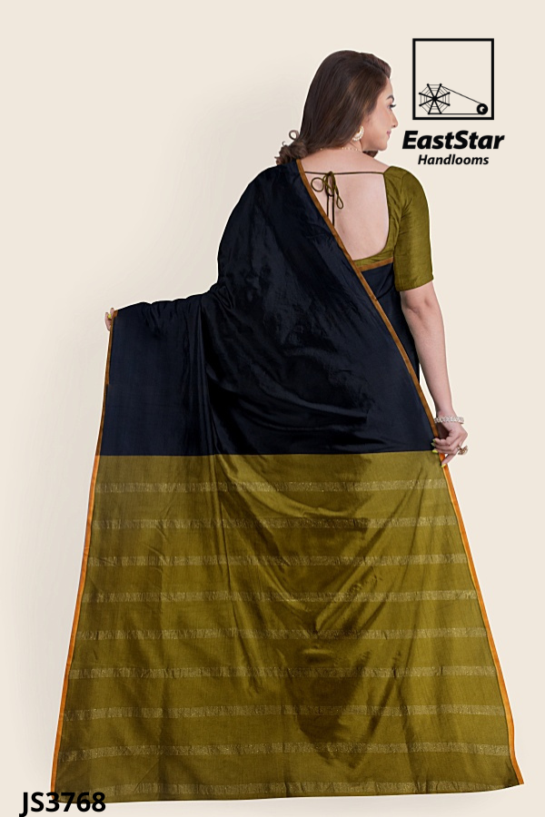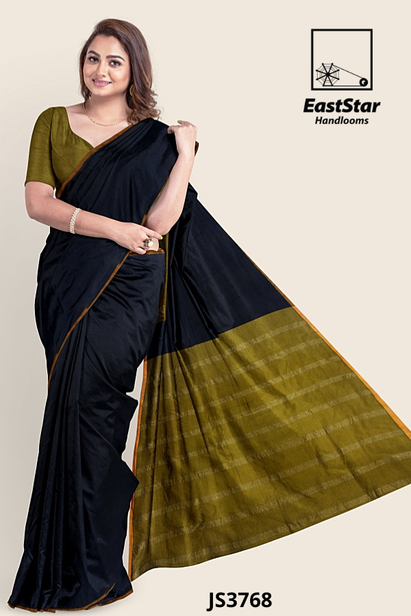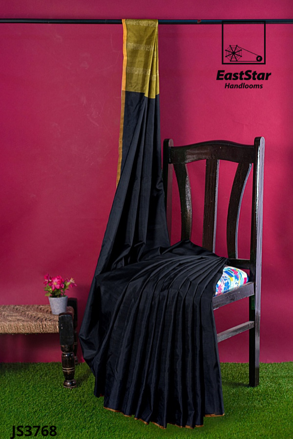 Drape yourself in effortless grace with the EastStar Handlooms JS3768, a black gold saree edged with a refined mustard gold border. The pallu flows from inky black to lush olive green, revealing subtle woven stripes that catch the light—an exquisite woven striped pallu saree that pairs beautifully with a deep V-neck blouse. Handloom artistry and modern polish make this black saree gold pallu with mustard gold border your go-to for weddings, festivities, and power meetings. Buy black gold saree now—order black saree mustard border from EastStar Handlooms or buy woven striped pallu saree JS3768 and claim its timeless allure.