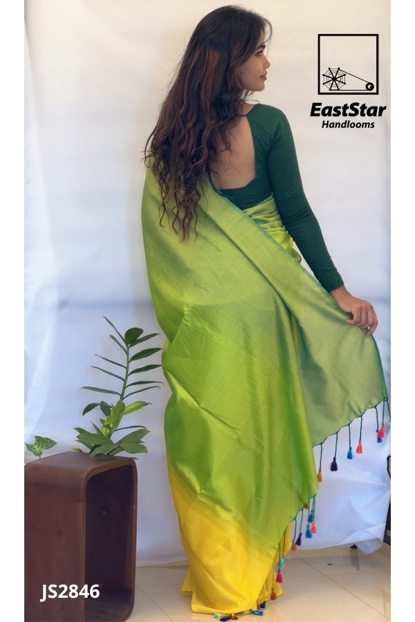 Experience the allure of EastStar Handlooms with the JS2846 vibrant dual-toned saree, a masterpiece blending lush green and radiant yellow. This saree, paired with a matching rich green blouse, embodies elegance and contemporary style, perfect for any occasion. Its striking colors make a statement, ensuring you stand out effortlessly. Crafted for the discerning fashion enthusiast, this piece from the green yellow saree collection invites you to explore colorful dual-tone sarees, adding a vibrant touch to your wardrobe. Make the alluring choice today and order the EastStar Handlooms vibrant saree online to embrace grace and poise.