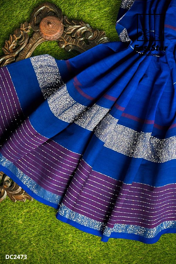 Drape yourself in timeless elegance with our Bright Blue Saree, adorned with subtle red and white line patterns, and accented by a shimmering silver border. This saree is a symphony of style and grace, perfect for any special occasion. The stylish blue party saree comes with a matching blouse, featuring exquisite silver embellishments on the sleeves, adding a touch of opulence to your ensemble. Elevate your wardrobe with this sartorial masterpiece that promises to make heads turn. Order this shimmering silver-bordered saree today and embrace the allure of metallic tones and elegant design.