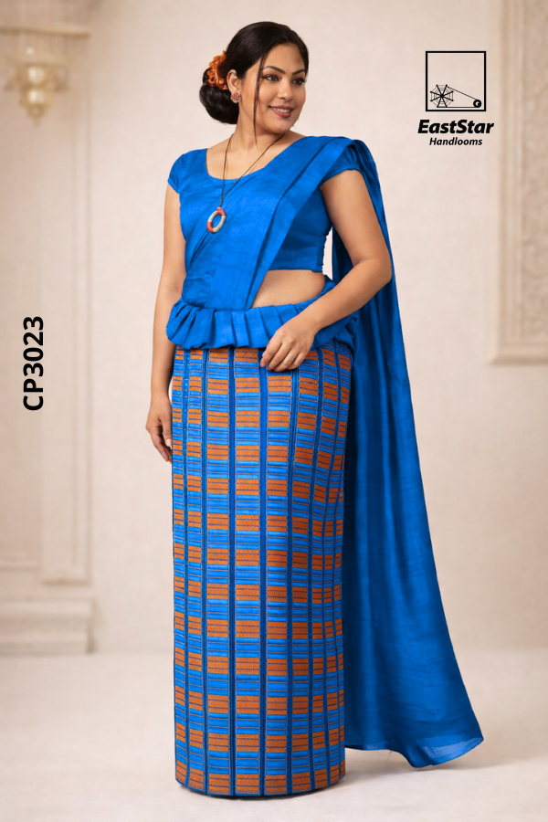 This saree is a stunning traditional Sri Lankan Kandyan (Osariya) style piece featuring a rich blue upper drape paired with a beautifully patterned lower skirt. The skirt showcases a striking geometric design in vibrant orange and blue, arranged in a neat grid pattern that adds a bold, modern touch to the classic look. The fabric appears to be a smooth, lightweight cotton or handloom blend, offering both comfort and elegance. It is styled with a matching blue blouse, creating a clean and sophisticated finish. The structured waist frill enhances the authentic Kandyan silhouette, while the single-side pallu flows gracefully, completing the refined and graceful appearance—perfect for cultural events, festive occasions, or elegant day wear. who have a classy tassel
