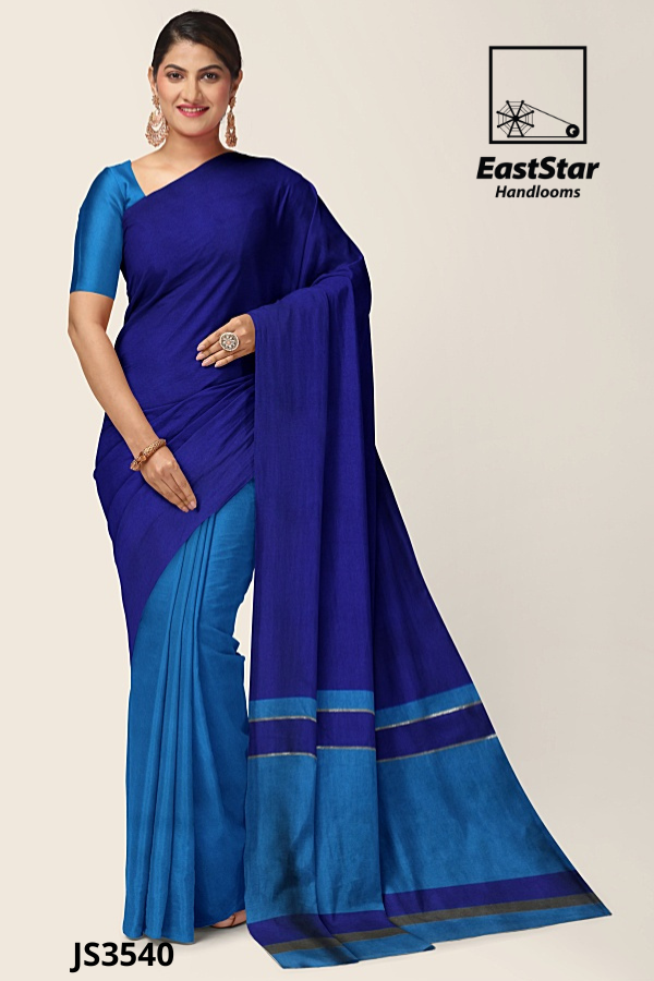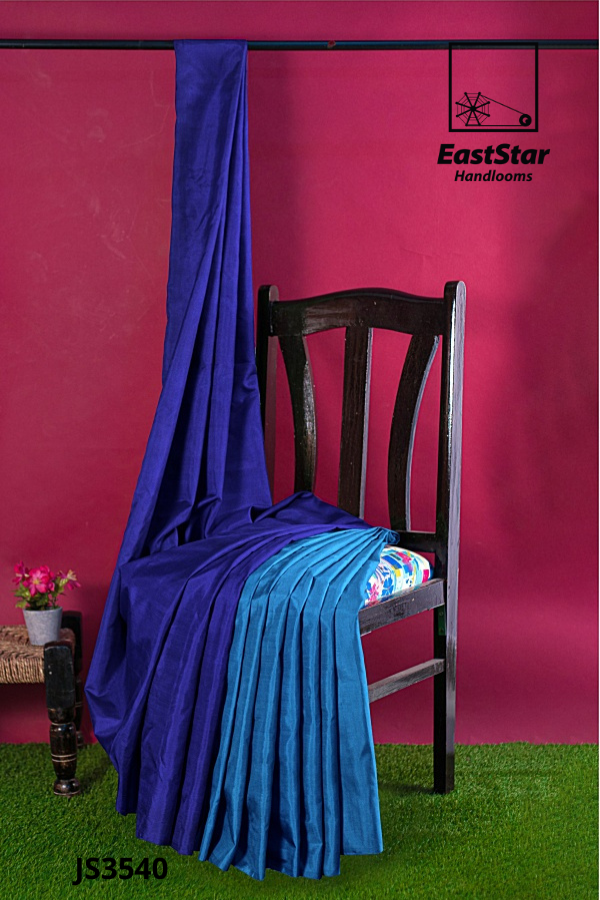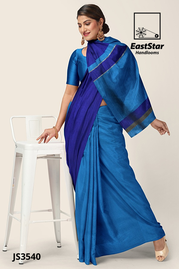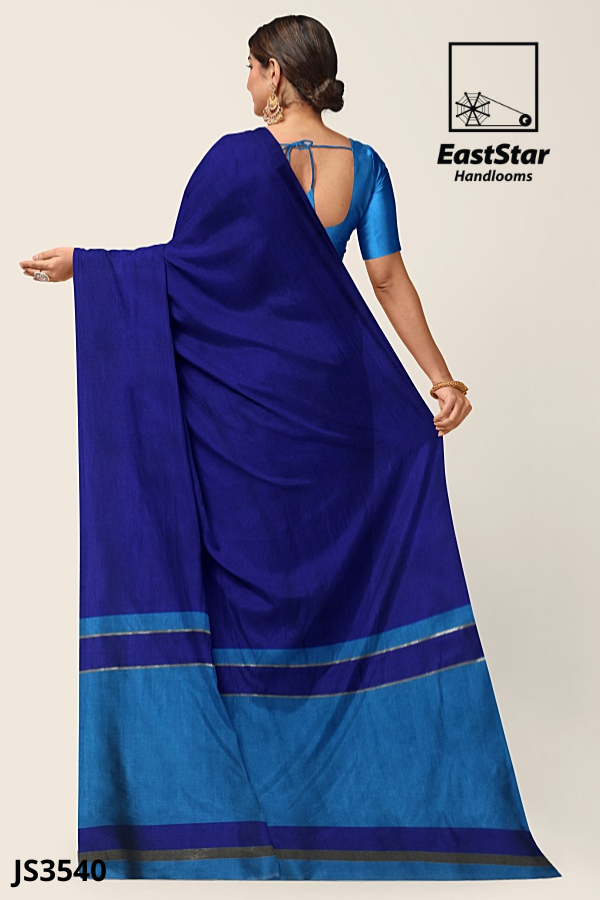 Unveil timeless grace with the Indigo blue contrast pallu saree EastStar Handlooms JS3540, crafted to make every entrance unforgettable. The royal blue body flows into a bright teal blouse and pleats, while the pallu showcases a refined teal border with a delicate silver striped accent and a deep blue edge – an elegant silver striped border festive saree designed to flatter. This Royal blue saree by EastStar Handlooms brings artisan sophistication to weddings, receptions, and polished workwear, with a teal blouse matching contrast saree finish you’ll reach for again and again. Ready to shine? Buy indigo blue contrast saree now, order teal border striped saree today, and buy royal blue pallu saree JS3540 to elevate your wardrobe.