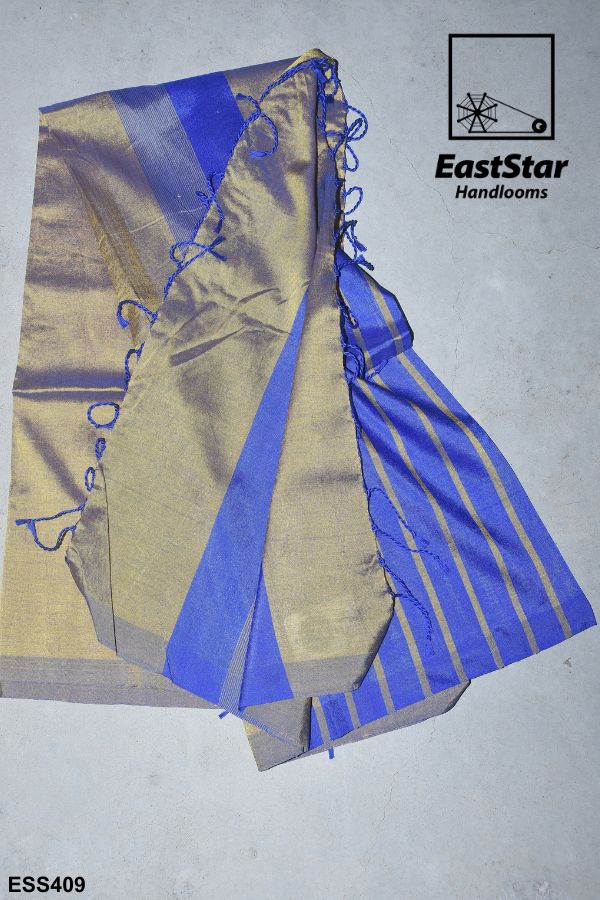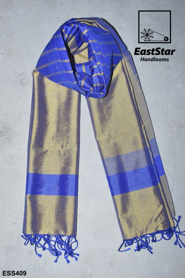 Wrap yourself in elegance with our exquisite Metallic Gold and Royal Blue Scarf, designed to elevate your style with its luxurious color palette and intricate detailing. This fashion-forward textile combines wide stripes of shimmering gold with subtly patterned royal blue bands, creating a striking contrast that catches the eye. Finished with chic blue tassels, this scarf is the perfect blend of sophistication and charm. Ideal for any occasion, make a statement with this stunning accessory and transform any outfit into a masterpiece. Order your metallic striped textile and add a touch of opulence to your wardrobe today!