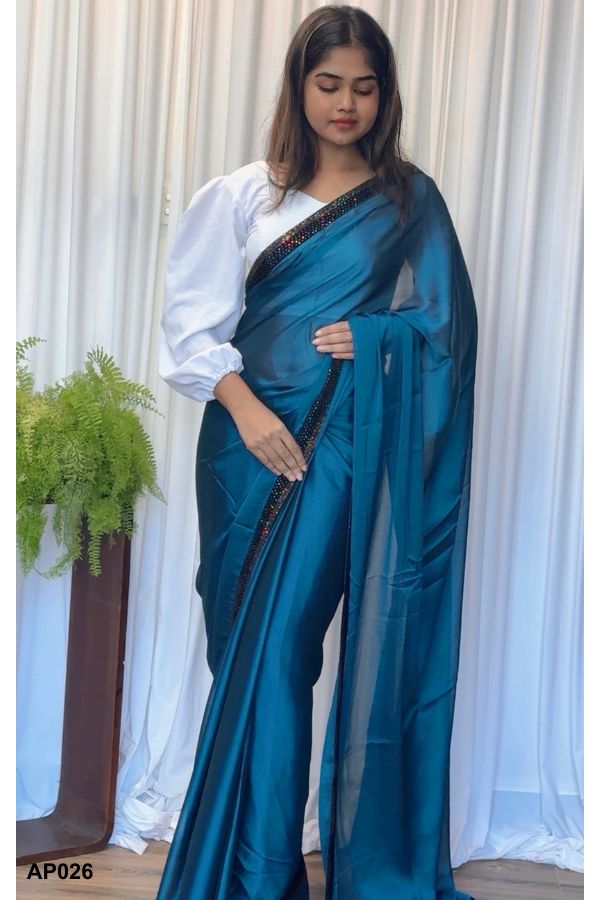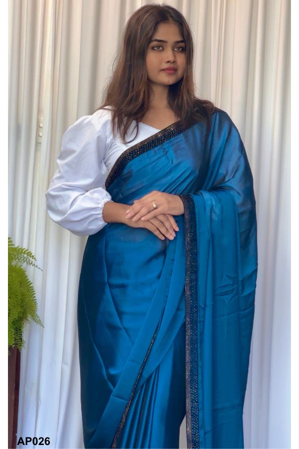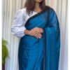 Elevate your elegance with this exquisite dark teal saree, meticulously designed with a shiny black border that enhances its timeless allure. Perfectly draped over a classic white blouse featuring charming puffed sleeves, this saree embodies a harmonious blend of tradition and contemporary style. The rich color contrasts beautifully against lush greenery and warm wooden tones, creating a vibrant yet sophisticated aesthetic. Experience the grace and grandeur of our traditional teal saree collection and make a bold fashion statement. Explore this masterpiece for your next occasion and effortlessly captivate attention. Purchase your dark teal saree with a black border online today and unlock a world of timeless elegance.