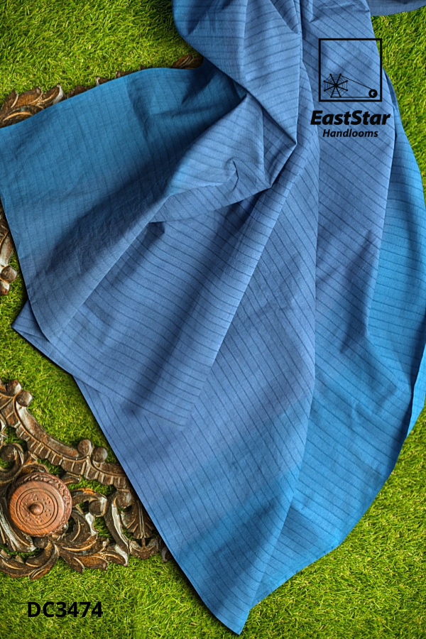 Fabric Pure Cotton Length and Width 6.15 Meters, 1.19 meters Blouse Piece 1 meter in Blue Ombre with black stripes Weave style Handwoven Description East Star presents this airy and lightweight Handlooms saree for those special occasions. This natural fabric settles around you as if they are part of your own skin. This Coffee Blue & Grey Combination and woven for those who have a classy taste