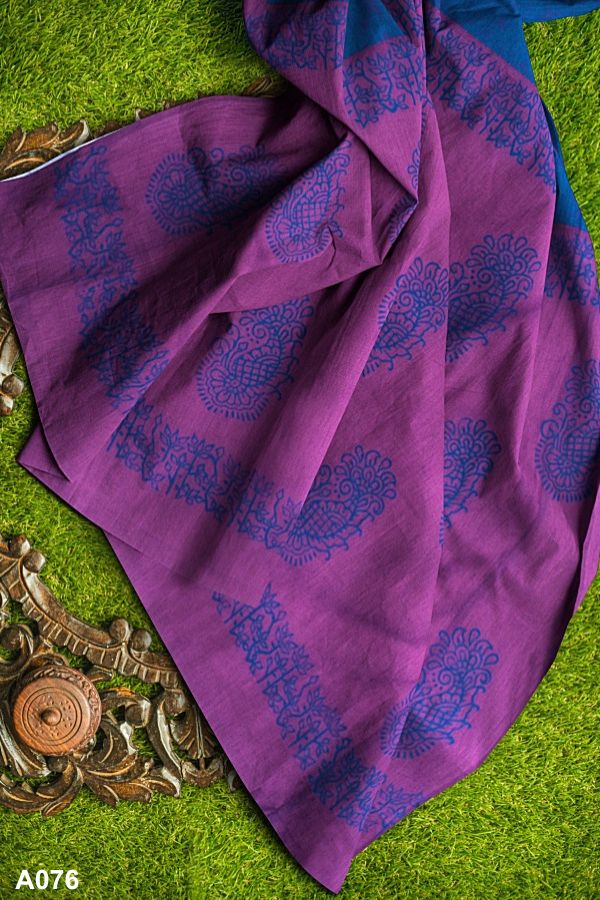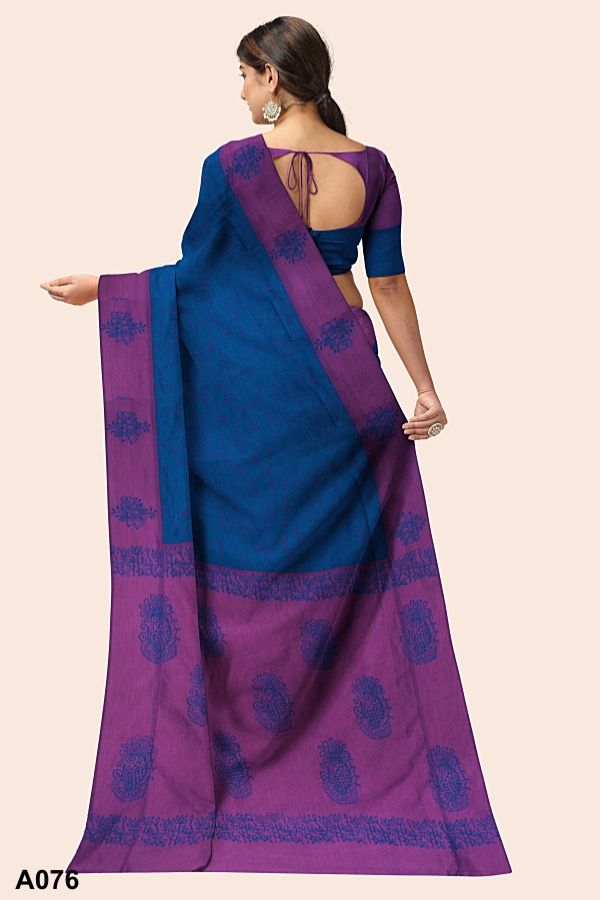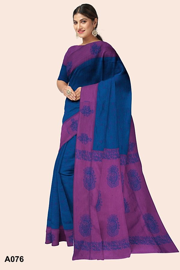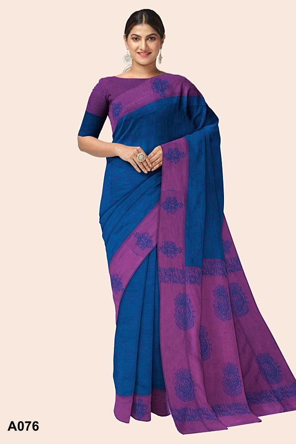 Step into elegance with our captivating traditional Indian saree, where the rich harmony of blue and purple comes alive. This exquisite saree, characterized by a striking purple border and intricate blue floral patterns, is a testament to timeless beauty. Its accompanying purple blouse adds a perfect touch of sophistication, amplifying the saree\’s charm. Paired with ornate jewelry, like the elegant circular earrings and intricate ring, this blue saree with purple border presents a perfect combination of tradition and style. Elevate your wardrobe by ordering this stunning floral pattern saree design online and embrace the elegance of Indian craftsmanship.