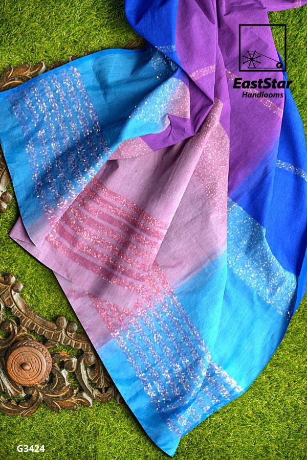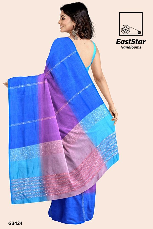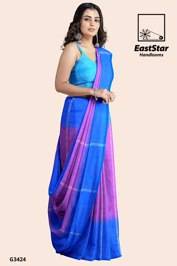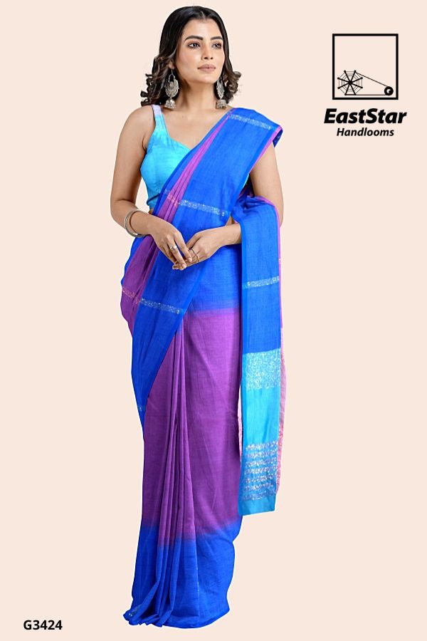 Step into elegance with our vibrant, colorful sari featuring rich shades of blue and purple adorned with intricate silver patterns. The cobalt blue and contrasting purple create a striking ensemble, perfectly complemented by a gradient pallu with a detailed silver band. Paired with a sleeveless blue blouse and accessories, this outfit radiates confidence and style. Elevate your wardrobe with our exquisite blue purple patterned sari, available now for purchase online. Indulge in timeless beauty and embrace your inner grace today!