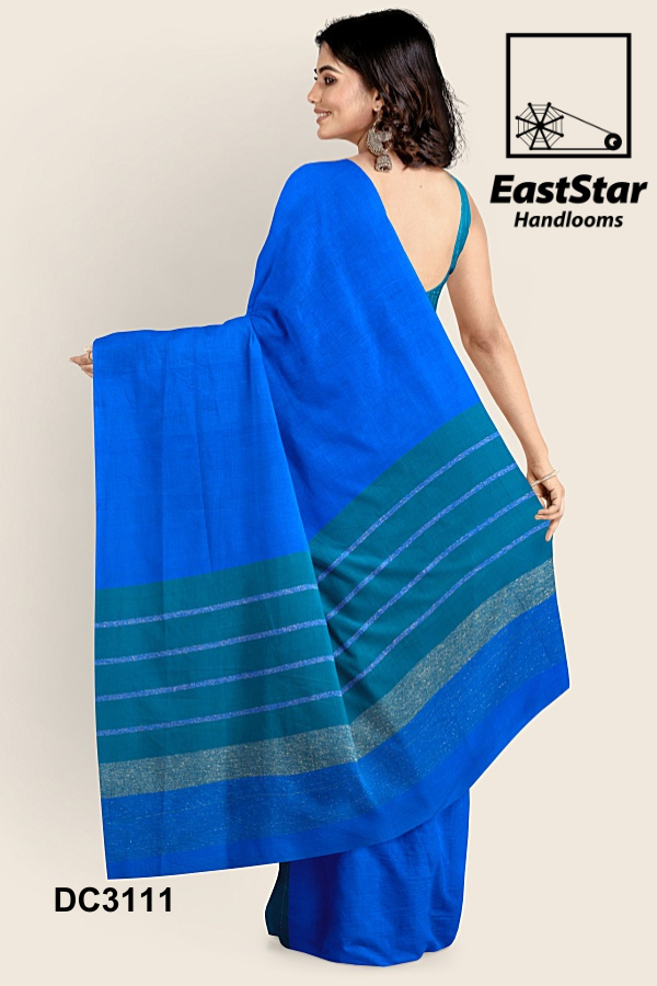 Embrace the elegant traditions with EastStar Handlooms\’ blue and teal sari! The striking blue with subtle metallic stripes creates a mesmerizing effect, leading to the teal pleats that echo the glamour. This exquisite \’EastStar DC3111\’ sari is complemented by a stylish teal blouse. With a delightful mix of tradition and modernity, understand why this sari is the top choice for making a statement. Accessorize your look with the paired silver earrings and bangles, an attire that tells a story. This handloom wonder is waiting to drape you in exquisite charm. Shop now and create your sensational fashion moment with our blue and teal sari – let\’s redefine this tradition together!