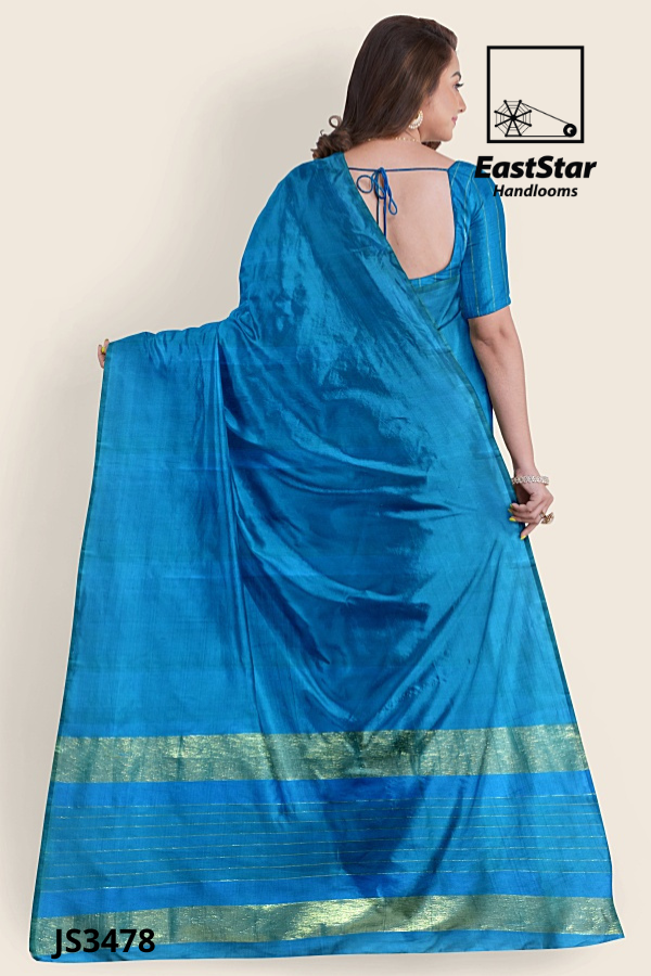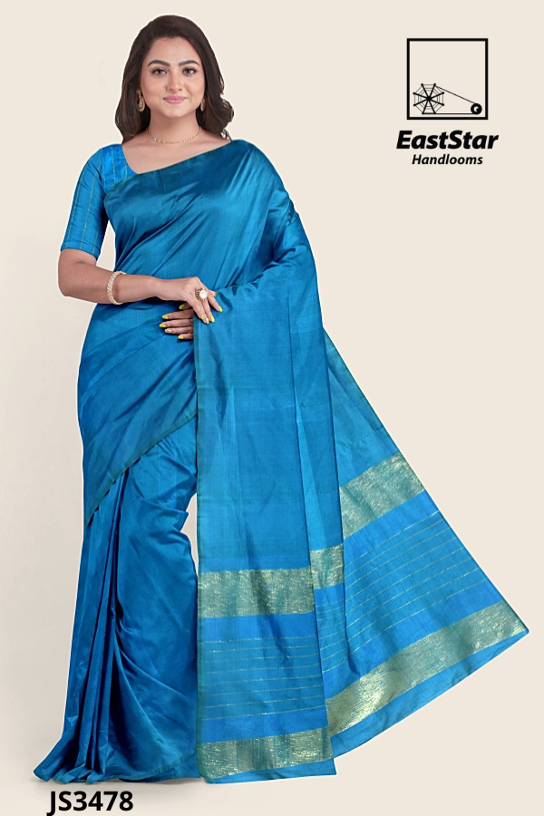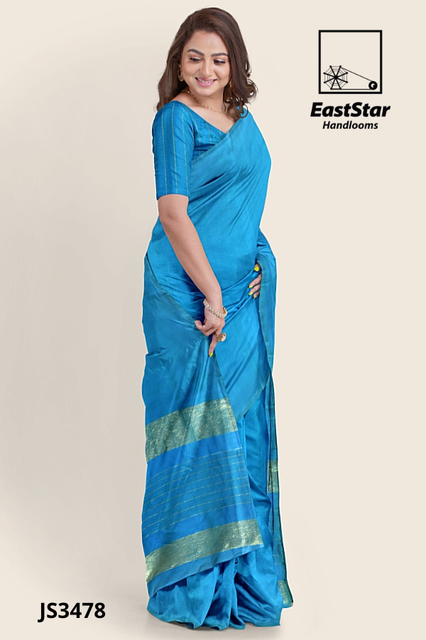 Radiate grace in the bright blue sari JS3478, a silk-finish creation from EastStar Handlooms that glows with a smooth, shiny drape and a perfectly matched short-sleeved blouse. The pallu showcases a refined gold zari border with wide metallic light-gold bands, several thin, evenly spaced parallel gold lines, and bold blue separations, creating a standout blue sari with metallic borders. Neatly arranged pleats and a fluid fall make this shiny blue festive sari an effortless choice for weddings, receptions, and special soirées. Buy blue zari border sari JS3478 now—your elegant silk finish blue sari design awaits; Order bright blue silk-finish sari from EastStar Handlooms and buy metallic gold border sari styles with confidence.