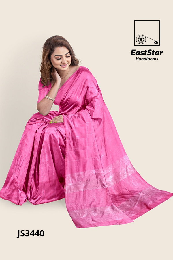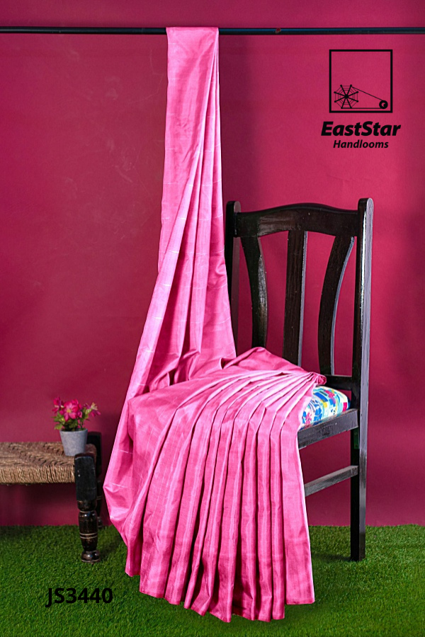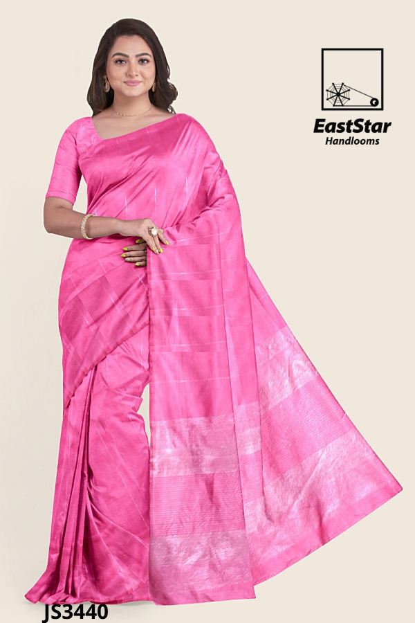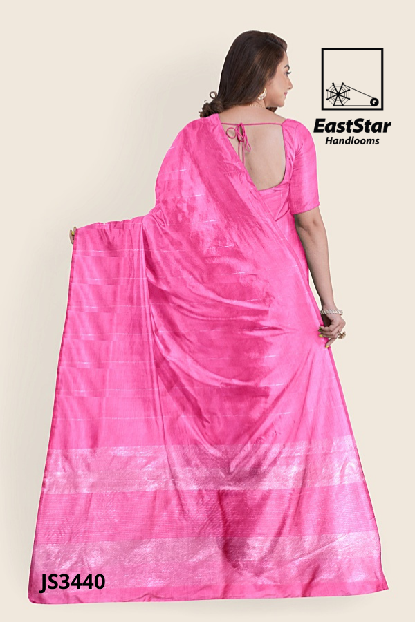 Shine in the Bright pink silk saree EastStar Handlooms JS3440—Glossy handloom pink saree EastStar that captures light with every move. Its silk-like, glossy finish and subtle woven stripes/blocks flow into a broader, shimmering striped pallu—an elegant, woven striped pallu silk saree designed for weddings, festivities, and keepsake photos. Paired with the matching short-sleeve blouse, this glossy finish pink silk saree frames your jewelry beautifully and elevates your glow from day to dusk. Buy bright pink silk saree today and experience the Pink silk saree EastStar Handlooms JS3440 difference—Order glossy pink handloom saree JS3440 and claim your signature look.