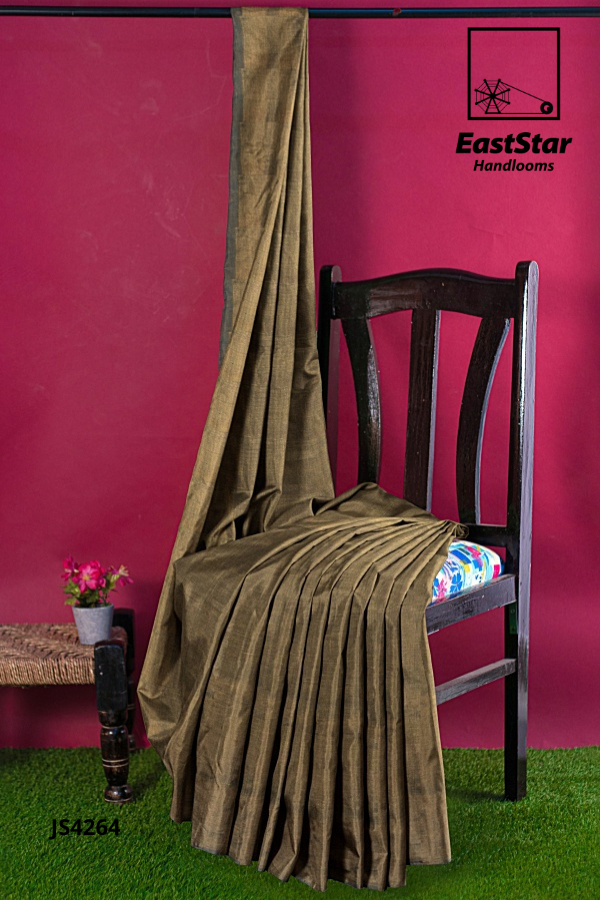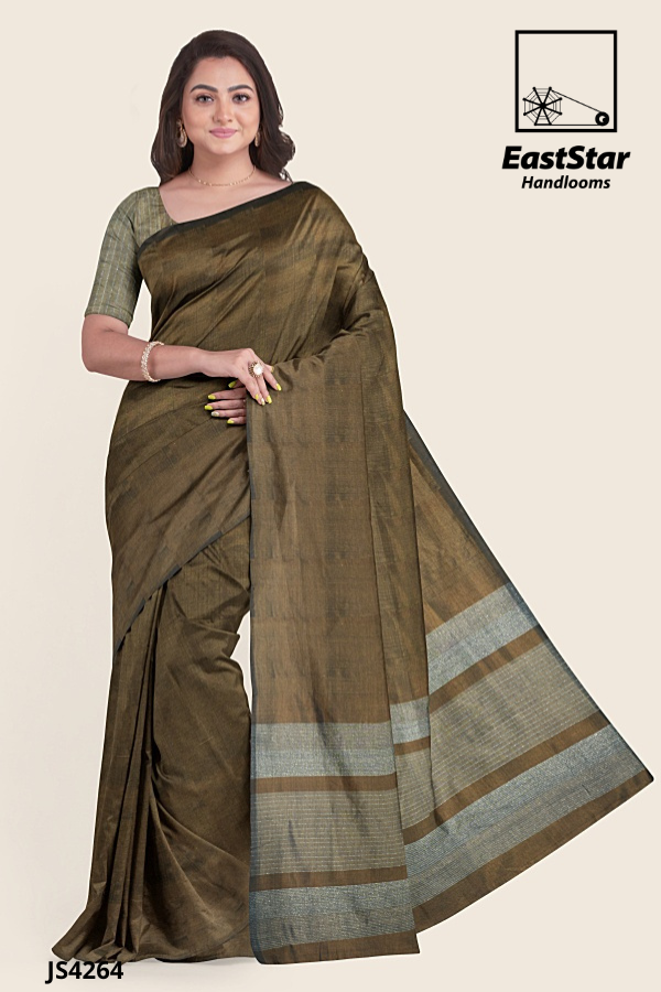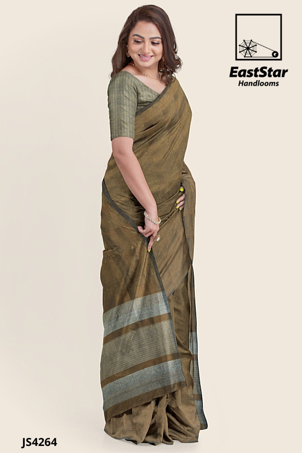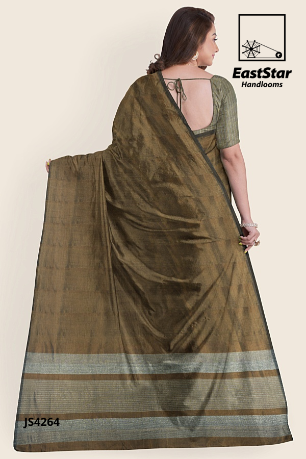Embrace elegance with the EastStar Handlooms JS4264 brown saree, a masterpiece of craftsmanship embodying timeless tradition. This exquisite saree, with its textured handloom look and a subtle sheen, is a perfect blend of comfort and style. The deep back cut blouse tied with elegant strings accentuates your grace, while the simple gray and brown border adds a touch of sophistication. Ideal for any occasion, this versatile saree is your go-to choice for showcasing subtle class. Order your affordable textured handloom saree online and redefine elegance in simplicity.
