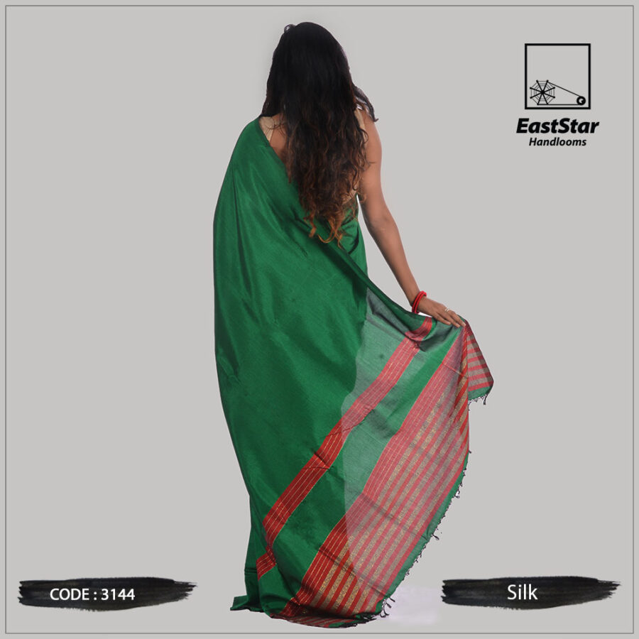 Bring out the fashionista in you by wearing this extravagant designer Handloom silk saree. The shiny silk fabric and the Bottle Green makes it an instant hit at any party. Notice the lovely colors on the full body of the saree, that seems to make it Rich look of the saree. It even comes with a blouse piece in beige to complete your look.