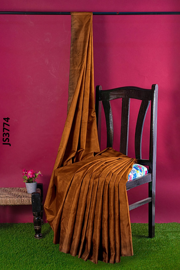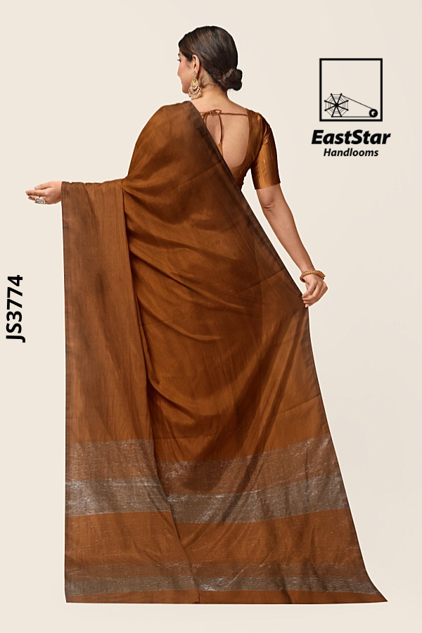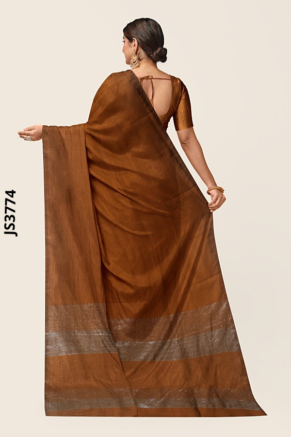 Turn heads in the copper brown saree JS3774, a rich brown copper saree JS3774 that flows like liquid light. The plain glossy body is impeccably pleated, while a floor-grazing pallu ends in two wide silver gray bands with a subtle metallic texture for striking contrast; a matching short-sleeve blouse with an elegant boat neckline completes the look. Refined yet radiant, this plain glossy copper brownsaree with a silver border balances tradition and modern ease for receptions, cocktails, and festive moments. Buy glossy copper brown saree online and order copper saree silver border today; this silver gray bands saree JS3774 is your go-to copper saree metallic bands style, also perfect if you seek a plain copper brown saree silver bands, a glossy copper brown saree with blouse, or a copper brown saree boat neckline blouse; Buy plain copper brown pallu saree now.