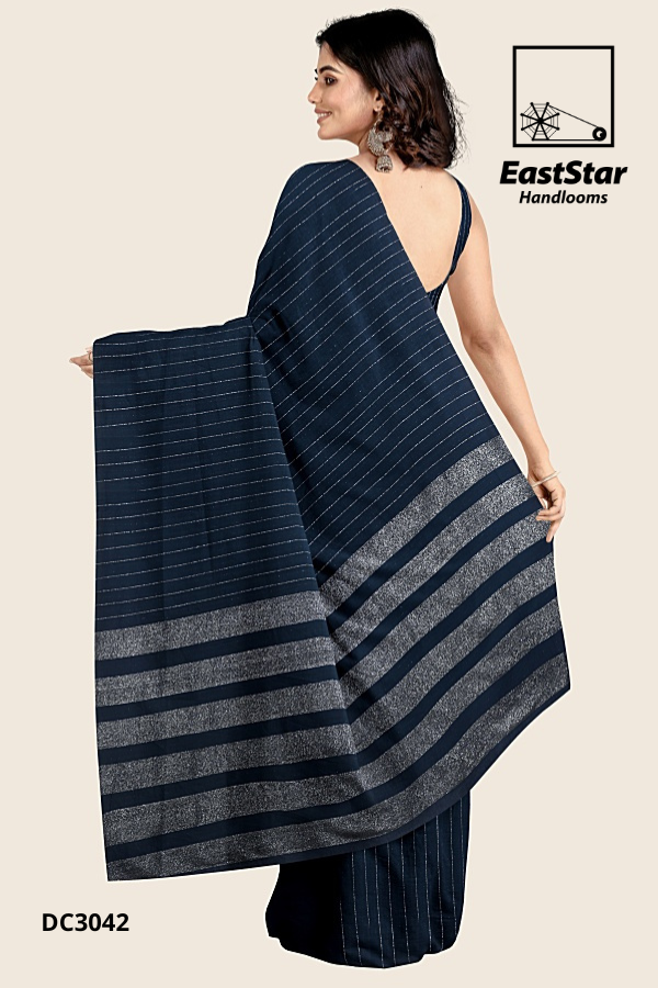 Step into timeless elegance with the exquisite EastStar Handlooms dark blue sari, masterfully crafted for those who appreciate refined sophistication. This elegant sari, adorned with subtle silver striped patterns, exudes a regal charm that is perfect for any high-class occasion. The sleeveless blouse seamlessly matches the sari, creating a harmonious ensemble. Embrace the grandeur of the silver-accented pallu draped gracefully over your shoulder. Complete your look with statement earrings and bangles, enhancing your radiant beauty. Let the EastStar spinning wheel logo be your assurance of heritage craftsmanship and unmatched quality. Elevate your wardrobe by ordering this stunning dark blue striped sari today!