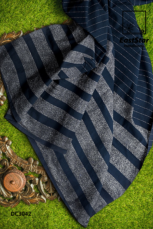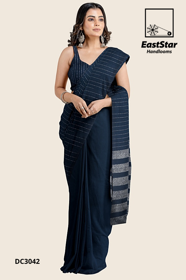 Fabric Pure Cotton Length and Width 6.15 Meters, 1.19 meters Blouse Piece 1 meter in dark blue with silver stripes Weave style Handwoven Description East Star presents this airy and lightweight Handlooms saree for those special occasions. This natural fabric settles around you as if they are part of your own skin. This Color Combination and woven for those who have a classy taste.