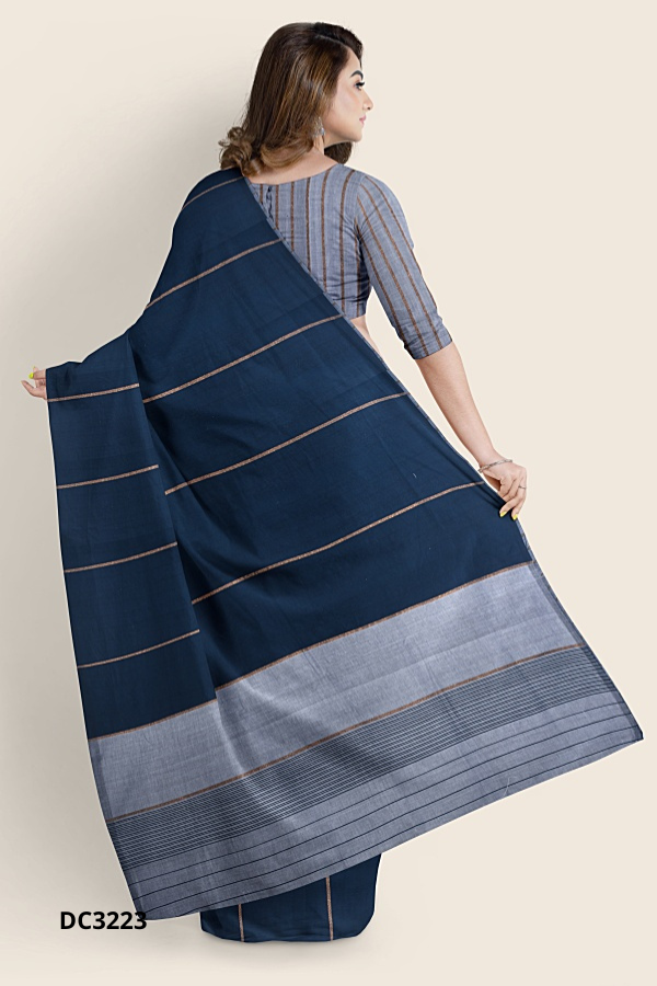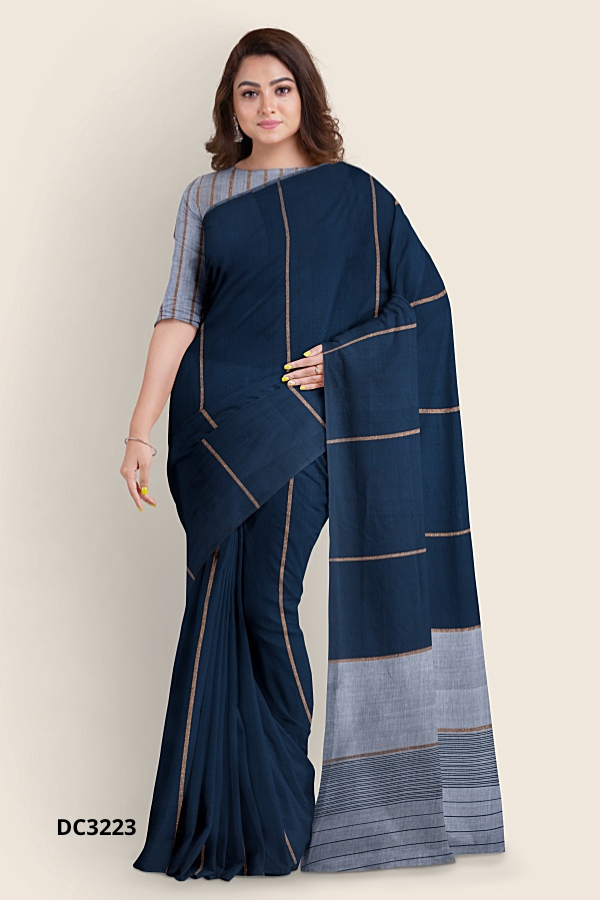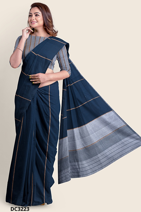 Unveil elegance with our DC3223 dark blue saree, a true embodiment of sophistication and style. Crafted with a mesmerizing checkered pattern and accented with a distinctive grey border and horizontal stripes, this saree is a perfect harmony of tradition and modernity. The flattering blue-grey striped blouse complements the detailed saree, making it an envious addition to any wardrobe. Embrace the allure of minimalist beauty with this elegant grey and blue saree, providing an impeccable choice for those special occasions where you wish to make a memorable statement. Step into the spotlight with this chic and stylish ensemble, designed to highlight the grace in you.