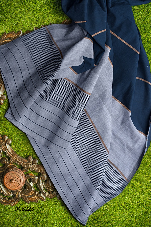 Fabric Pure Cotton Length and Width 6.15 Meters, 1.19 meters Blouse Piece 1 meter in grey with gold stripes Weave style Handwoven Description East Star presents this airy and lightweight Handlooms saree for those special occasions. This natural fabric settles around you as if they are part of your own skin. This Coffee Blue & Grey Combination and woven for those who have a classy taste.