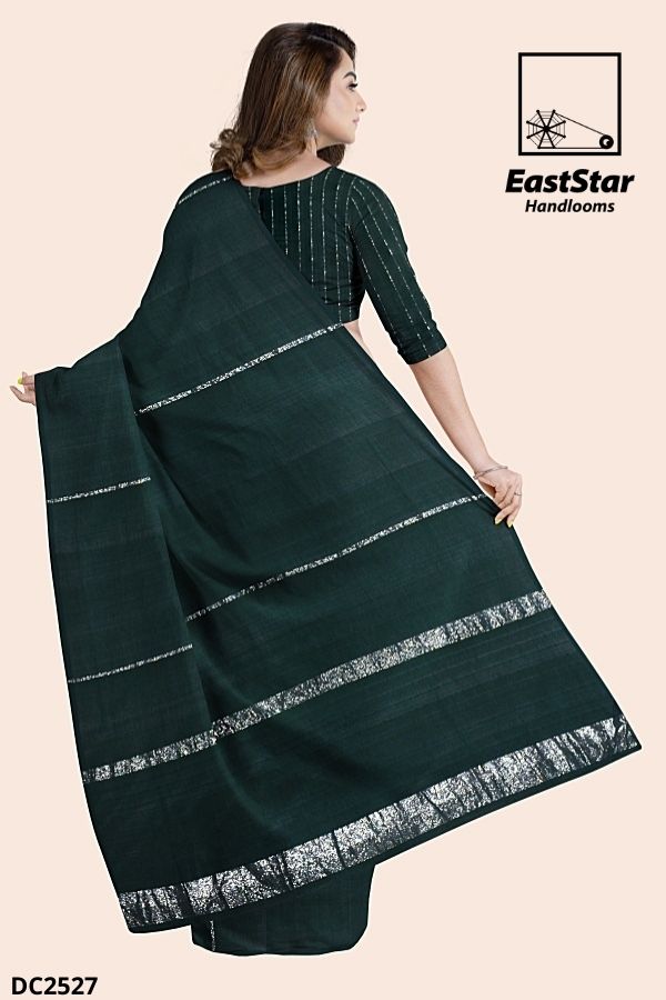 Experience elegance with our stunning Dark Green Silver Saree, a masterpiece that seamlessly blends tradition with contemporary style. This exquisite saree features fine horizontal silver lines and a prominent silver border that adds a touch of glamour to your festivities. The dark green hue serves as a perfect backdrop for the silver embellishments, making you stand out with grace and sophistication. Crafted for the discerning woman who appreciates beauty in simplicity, this saree is your perfect choice for any special occasion. Shop now to add this elegant saree with silver highlights to your wardrobe and make an unforgettable statement wherever you go.