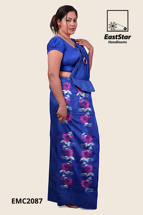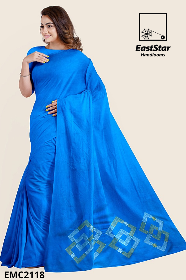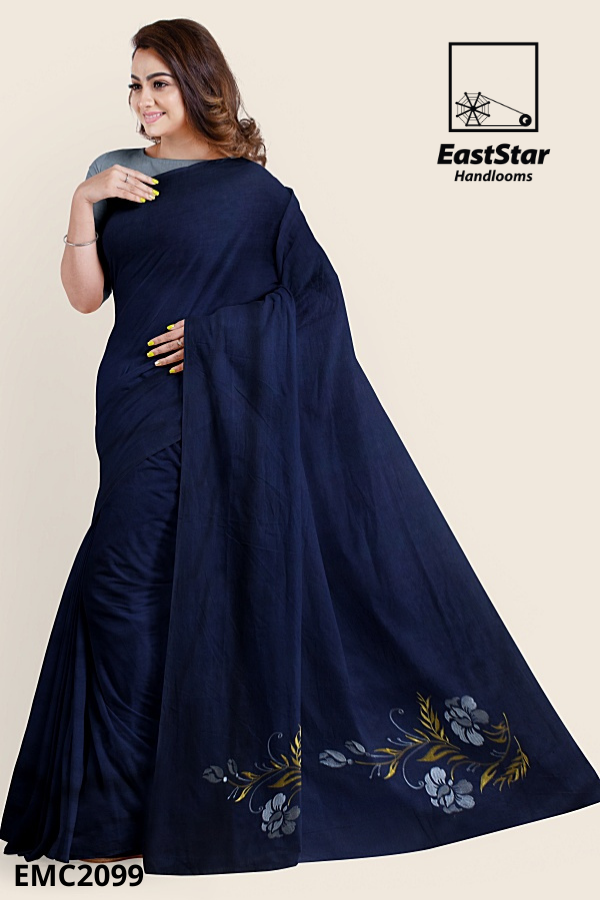 Meet EastStar Handlooms EMC2122, the ruffled waist sari in dark teal that turns heads with handloom finesse and lush, daisy-sunflower artistry. Handwoven to a fluid fall, the pallu drapes elegantly to the right while yellow florals with green centers and soft white accents create a striking, feminine silhouette. This teal floral handloom sari pairs beautifully with its matching blouse for weddings, festive evenings, and polished days, balancing artisanal heritage with modern style. Buy dark teal handloom sari now—Order green daisy motif sari and elevate your collection with this sunflower print ruffled sari from EastStar Handlooms; the perfect daisy print sari with ruffles for timeless allure.