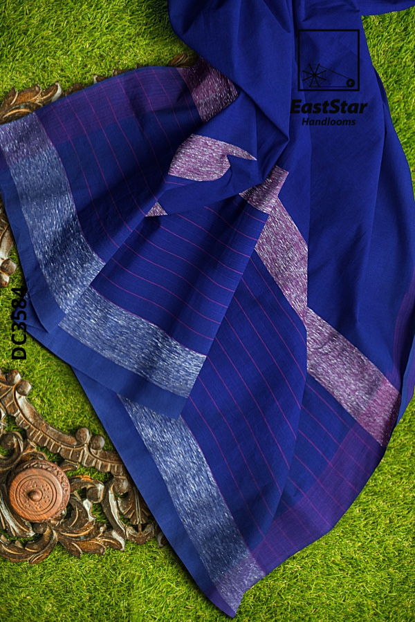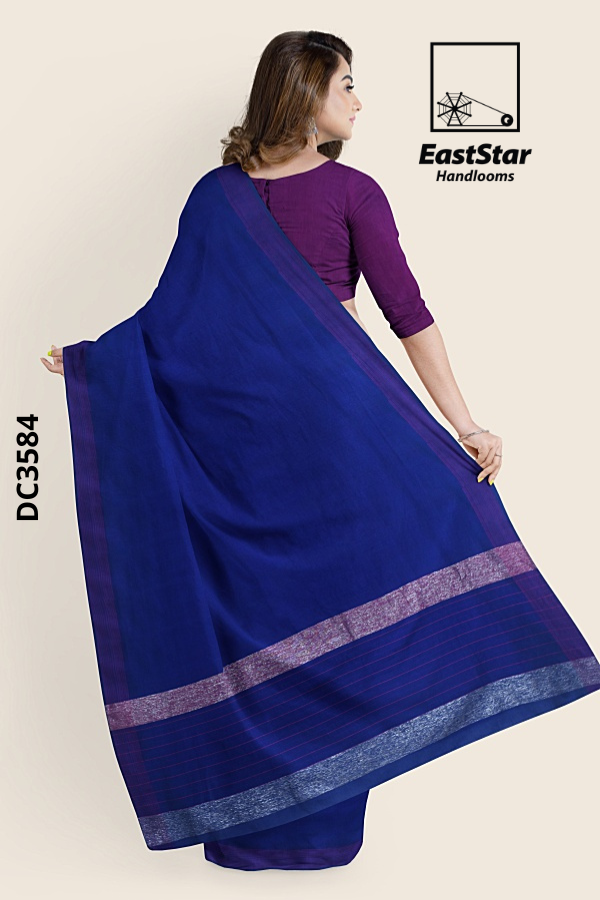 This elegant handloom cotton saree in a rich deep blue shade exudes timeless simplicity and grace, perfect for both everyday wear and special occasions. Crafted from soft, breathable cotton, it offers all-day comfort while maintaining a refined, structured drape. The saree is beautifully enhanced with subtle purple-toned borders and a neatly finished pallu featuring minimal striped detailing, adding a touch of understated sophistication. Paired with a matching blouse in a complementary tone, this saree blends traditional craftsmanship with modern elegance,