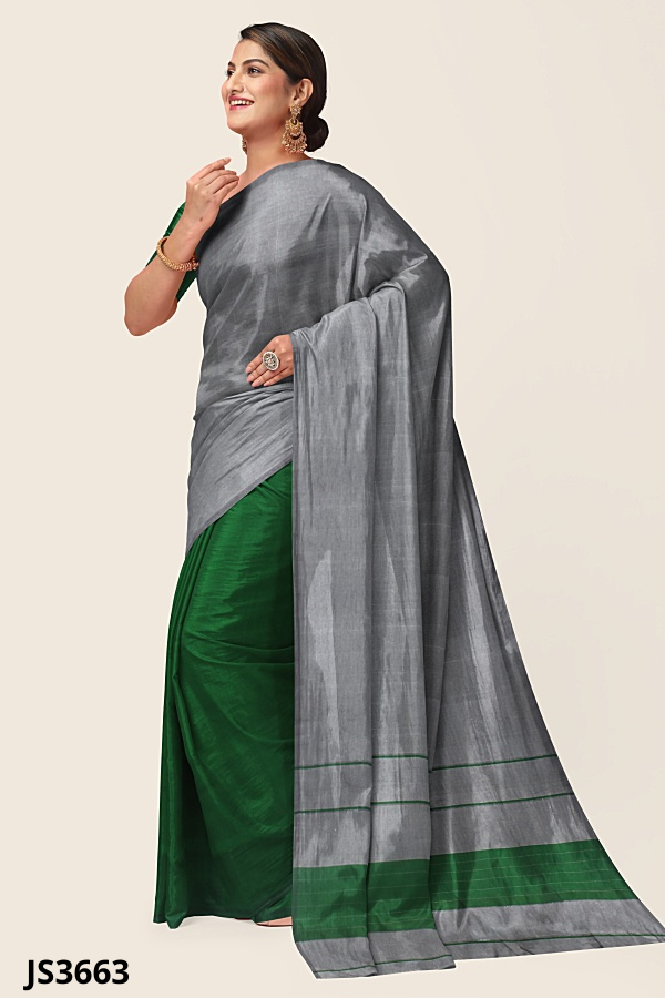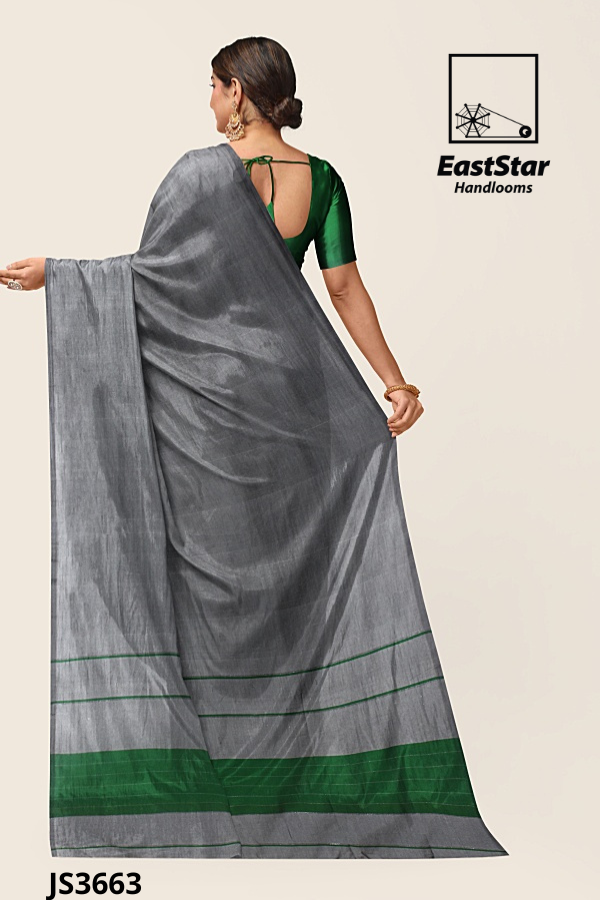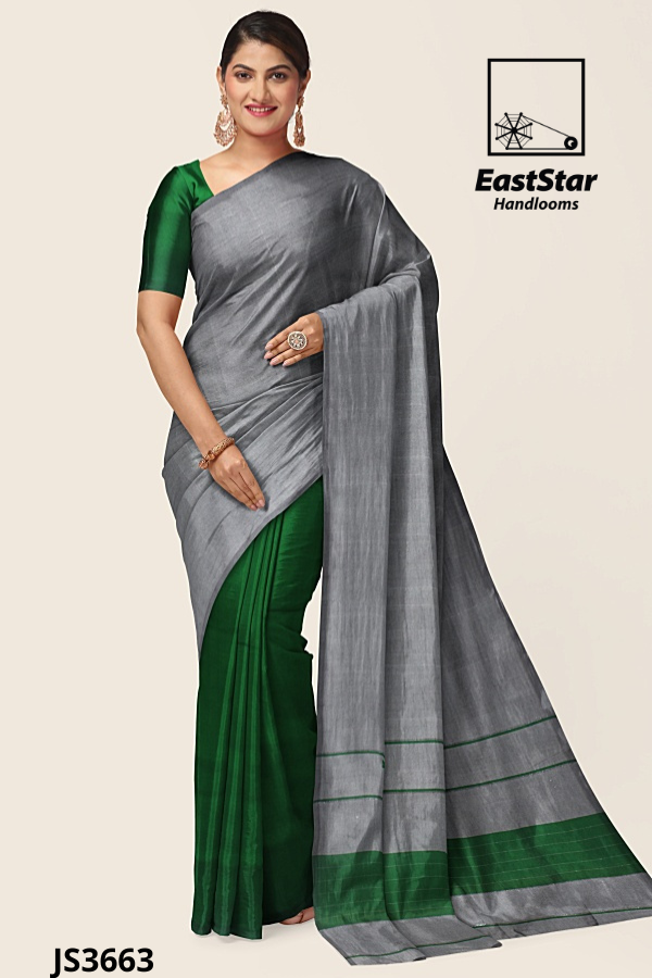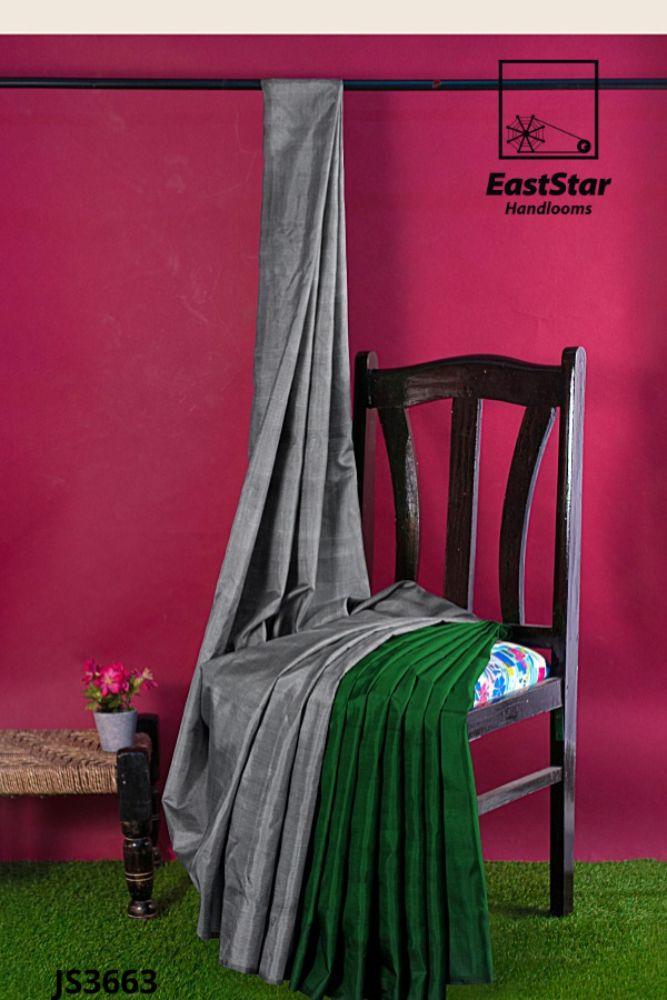 Elevate your occasion style with the handloom deep green gray saree EastStar JS3663, a refined blend of heritage craft and modern poise from EastStar Handlooms. Deep green harmonizes with a graceful gray pallu featuring delicate pinstripes and dark green bands, while rich green pleats create a timeless, flattering fall. This traditional green gray pinstripe saree is handloom-crafted for comfort and polish, an elegant gray pallu green saree for ceremonies and celebrations. Buy this deep green gray sari and pinstripe pallu handloom saree by EastStar Handlooms and make JS3663 your signature statement; order this traditional pinstripe pallu saree today and buy handloom green gray saree with confidence.