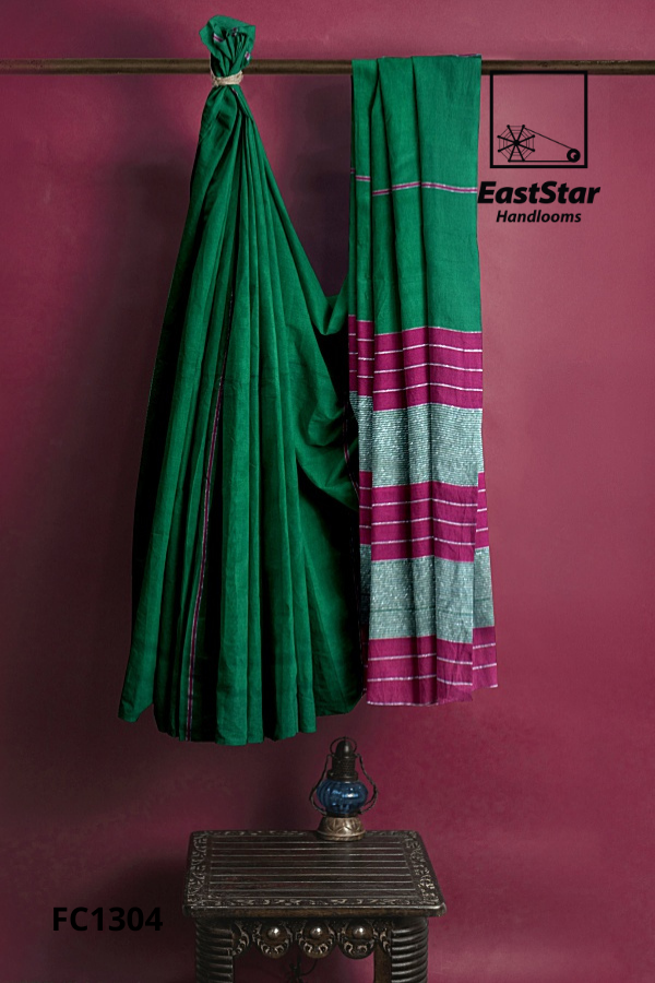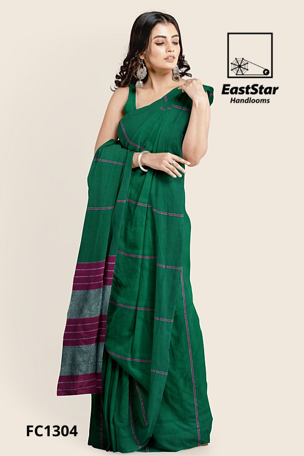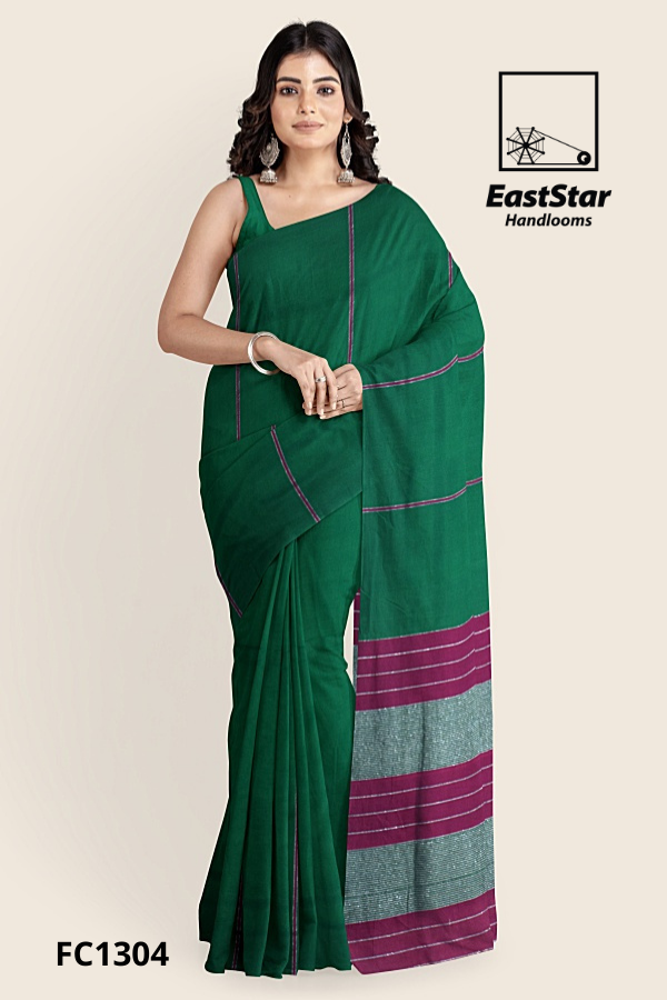 Discover the Deep green handloom saree EastStar Handlooms FC1304, finished with a refined magenta border and subtle vertical and horizontal lines that celebrate timeless craft. Its pallu features bold horizontal stripes—rich magenta bands framing a grey, check-like texture—delivering a standout Striped pallu saree EastStar Handlooms look with every graceful drape. Designed as a handloom style sari for women, this green saree with striped pallu and green handloom saree magenta piping pairs beautifully with silver jhumkas for weddings, work events, and festive evenings. Buy green handloom saree online today—Order magenta border green saree FC1304 and Buy striped pallu green saree you’ll treasure for years.