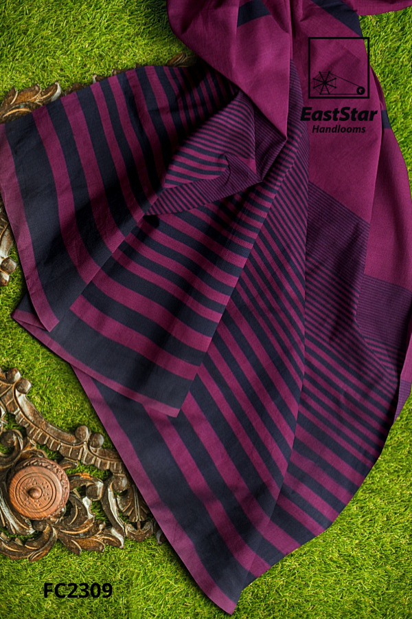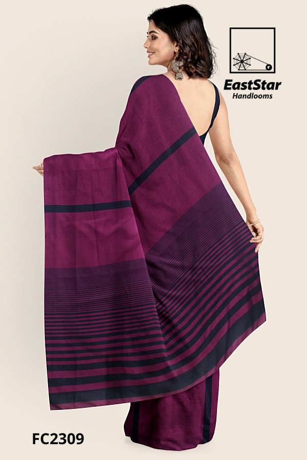 Wrap yourself in contemporary heritage with EastStar Handlooms FC2309, a deep magenta saree with stripes that dance in purple and black. The striped pallu showcases a bold dark band near the shoulder and alternating narrow and broad lines toward the fall, framed by a sleek black border for a sculpted, timeless drape. Pair this purple black striped saree with oxidized silver jhumkas and a black blouse for effortless elegance from festivals to workdays. Shop the Magenta striped saree EastStar Handlooms and the striped handloom saree EastStar FC2309 today—order this striped pallu border saree, a magenta purple striped pallu saree you will reach for again and again; buy magenta striped handloom saree or buy purple black striped saree now.