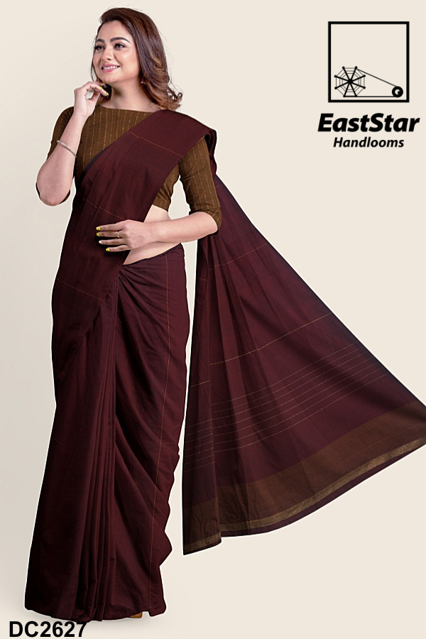 Fabric Pure Cotton Length and Width 6.15 Meters, 1.19 meters Blouse Piece 1 meter in brown with gold stripes Weave style Handwoven Description East Star presents this airy and lightweight Handlooms saree for those special occasions. This natural fabric settles around you as if they are part of your own skin. This Coffee Blue & Grey Combination and woven for those who have a classy taste.