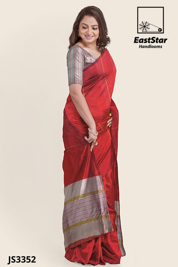 Introducing EastStar Handlooms EMC2054, a deep maroon handloom saree glowing with subtle sheen fabric and effortless grace. This plum leaf-motif sari features bold vertical foliage in grey and black and a straight, elegant pallu for modern drape. Perfect for celebrations or polished days, this maroon sari with pallu comes with a matching blouse and showcases artisanal leaf-motif design. Buy maroon handloom saree leaf-motif from EastStar Handlooms, buy plum handloom sari online, and order maroon leaf motif saree EMC2054 today to make this timeless piece yours.