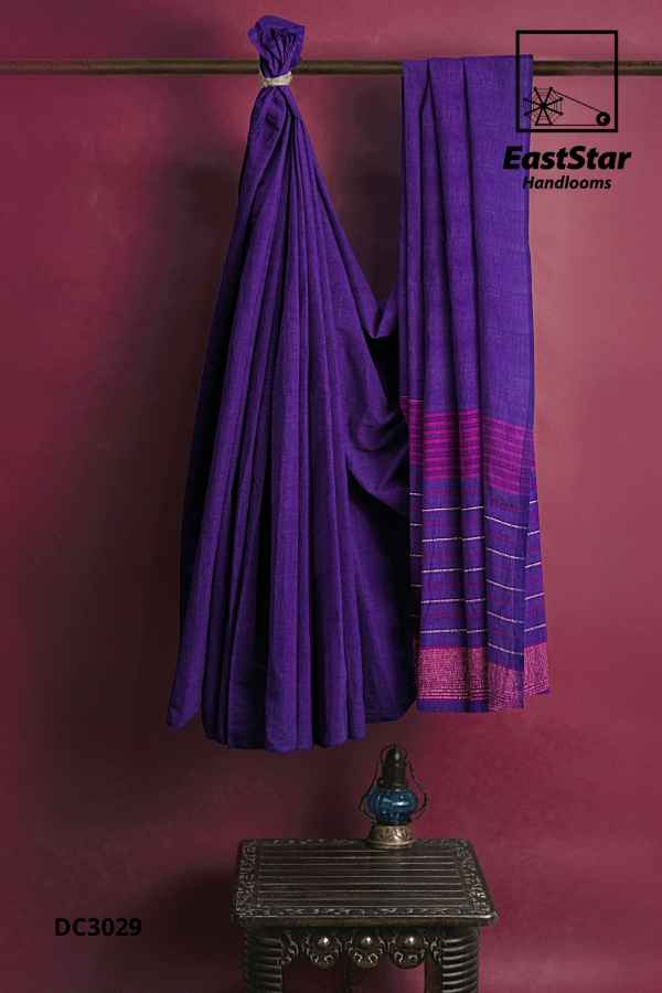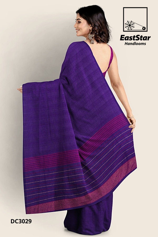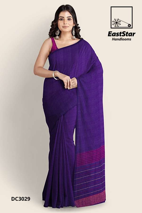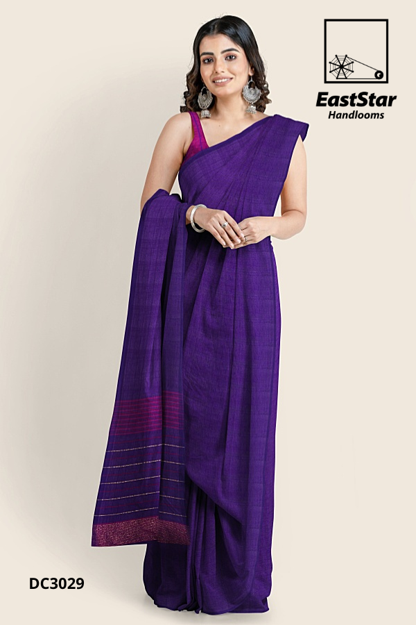 Unveil timeless elegance with the EastStar Handlooms Deep Purple Saree, a masterpiece designed for the modern yet traditional woman. This saree features exquisite deep purple fabric adorned with subtle patterns and a decorative lower border that has striking magenta horizontal lines. Pair it with the complementary sleeveless magenta blouse included, and enhance the look with elegant metallic bangle accessories. Perfect for any occasion, this ensemble embodies grace and sophistication. Elevate your wardrobe today with our exclusive EastStar Fashionable Saree Collection. Order your elegant deep purple saree now and step into refined luxury.
