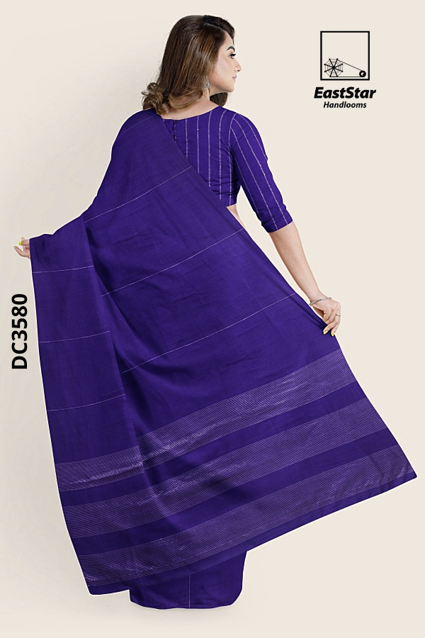 This elegant handloom cotton saree features a rich deep purple shade that exudes sophistication and timeless charm. Crafted from breathable, high-quality cotton, it offers a soft texture and all-day comfort, making it perfect for both casual and semi-formal wear. The saree is beautifully enhanced with subtle linear thread detailing across the body, adding a modern touch to its traditional appeal. The pallu stands out with minimalistic woven patterns, giving it a refined and graceful finish. Paired with a matching purple blouse, this saree creates a clean, monochromatic look that highlights understated elegance and effortless style.