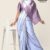 Elevate your special occasion wardrobe with our Elegant Traditional Dusty Lavender Sari, featuring a luxurious sheen and a stunning light blue hue. The exquisite sari set includes a matching short-sleeved blouse in a harmonious shade of dark blue and purple. Accentuate your look with ornate gold earrings and a matching bracelet, perfectly complementing the sari\’s elegance. Ideal for those who cherish tradition with a touch of luxury, this ensemble is a must-have. Buy this elegant traditional blue sari and accessories set now and make a statement.