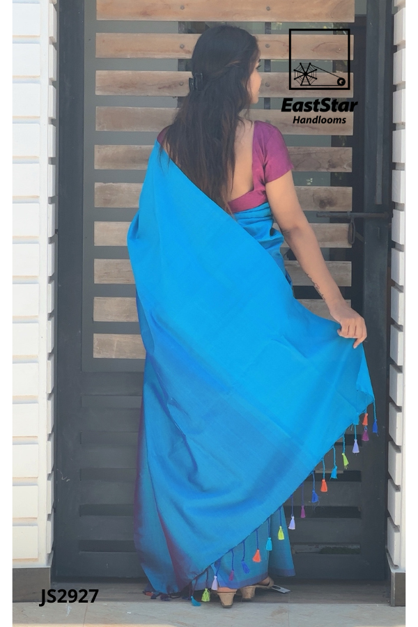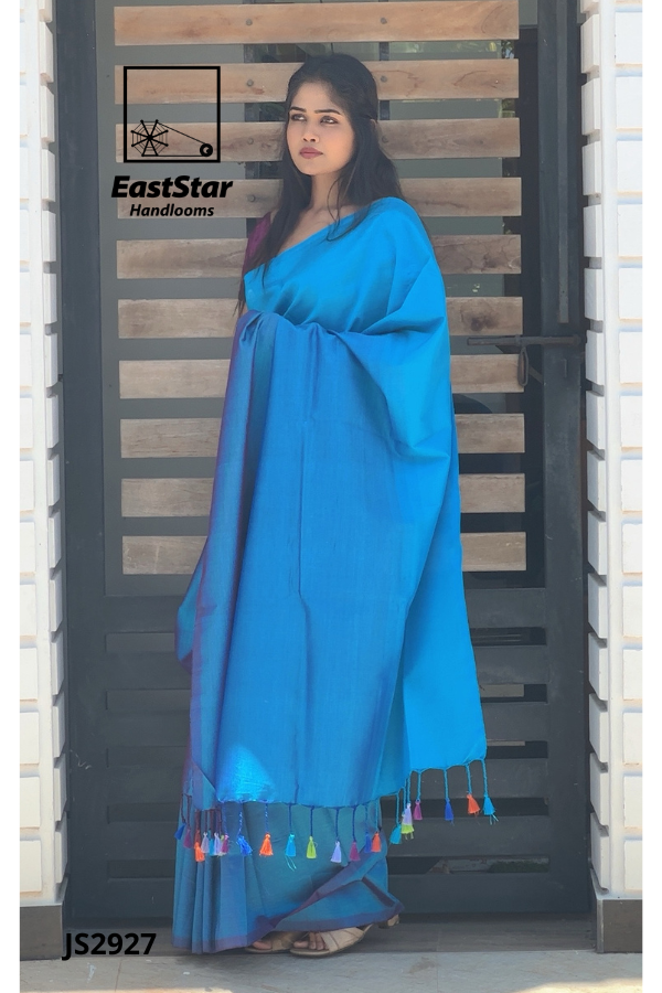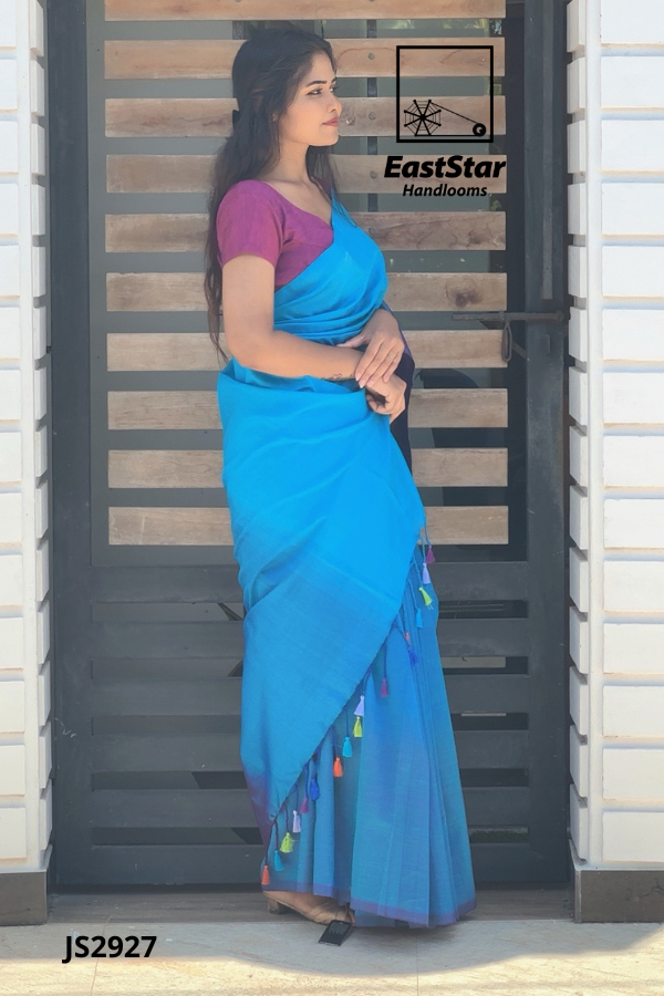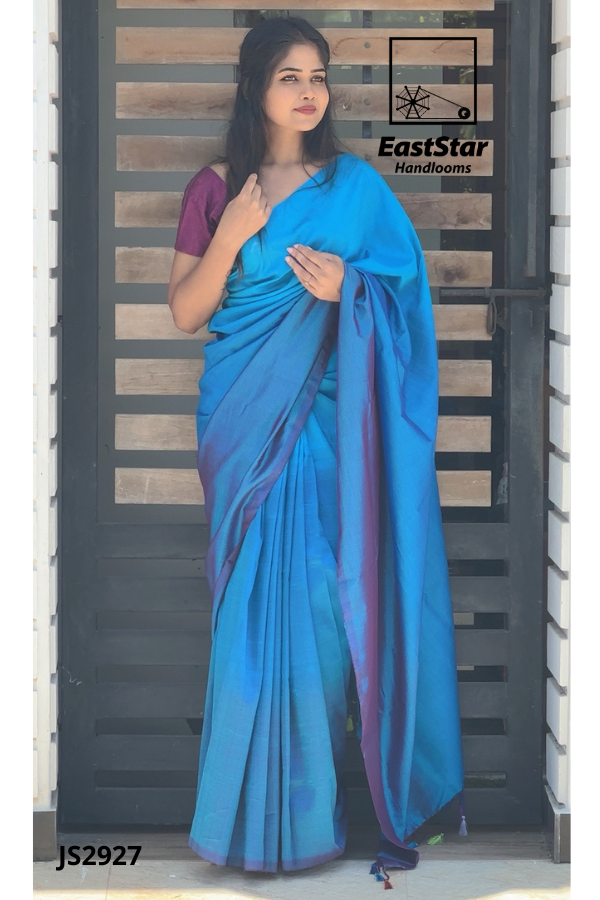 Embrace tradition with EastStar Handlooms’ mesmerizing blue saree, paired exquisitely with a contrasting purple blouse. This saree, marked by its subtle shine and classic drape, captures the essence of elegance and grace. Perfect for any occasion, the JS2927 is a timeless piece waiting to add a touch of sophistication to your wardrobe. Order now to experience the best in traditional blue silk sarees, and let your style radiate the beauty of heritage.