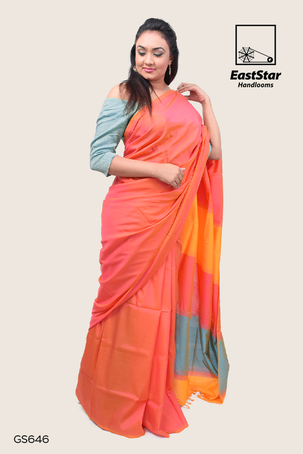 Bring out the fashionista in you by wearing this extravagant designer Handloom silk saree. The shiny silk fabric and the orange & Yellow,Blue colour makes it an instant hit at any party. Notice the exquisite finest Orange on the saree body that seems to make it Rich look of the saree. It even comes with a blouse piece in blue to complete your look.