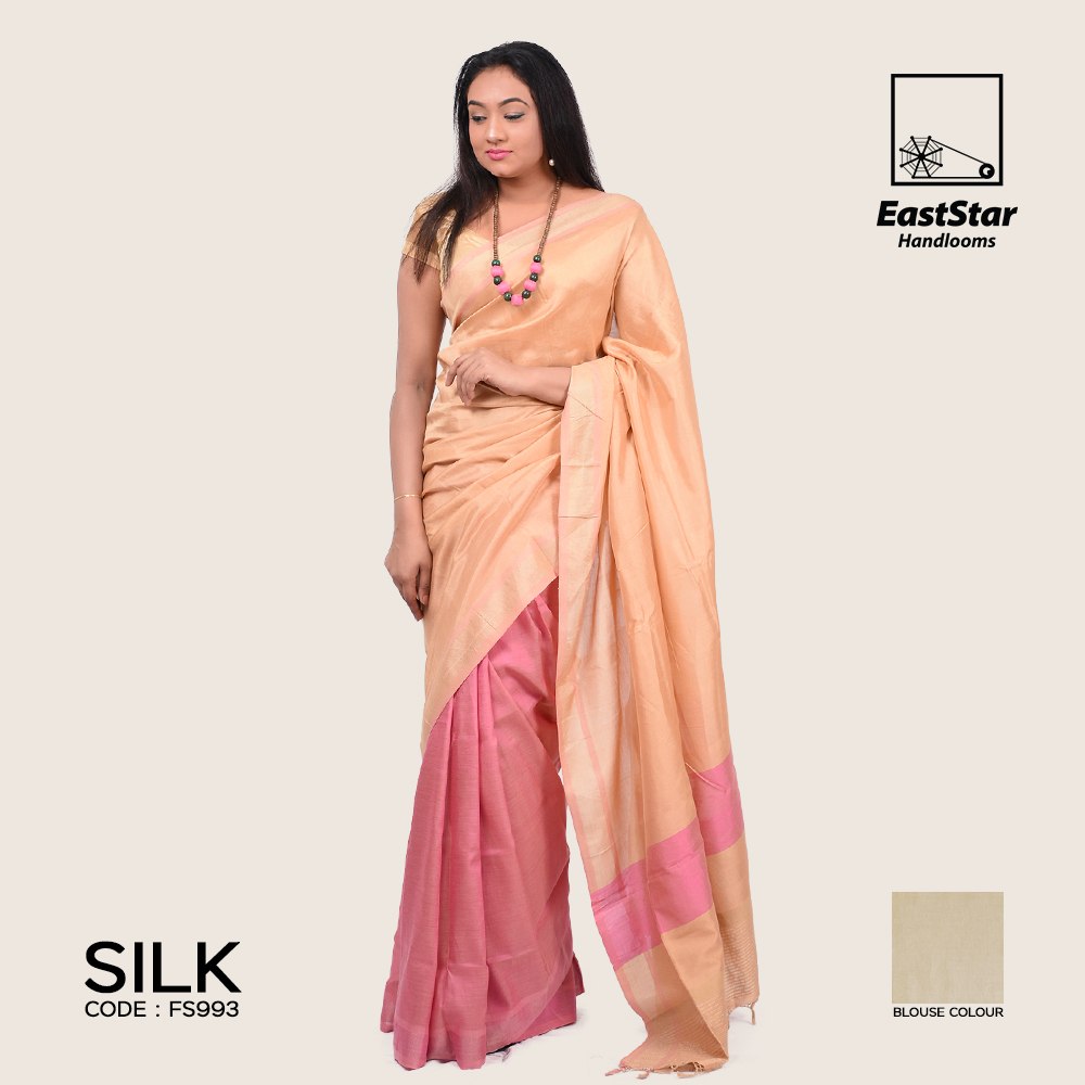 Bring out the fashionista in you by wearing this extravagant designer Handloom silk saree. The shiny silk fabric and the Marigold & Pink makes it an instant hit at any party. Notice the lovely colors on the full body of the saree, that seems to make it Rich look of the saree. It even comes with a blouse piece in beige to complete your look.