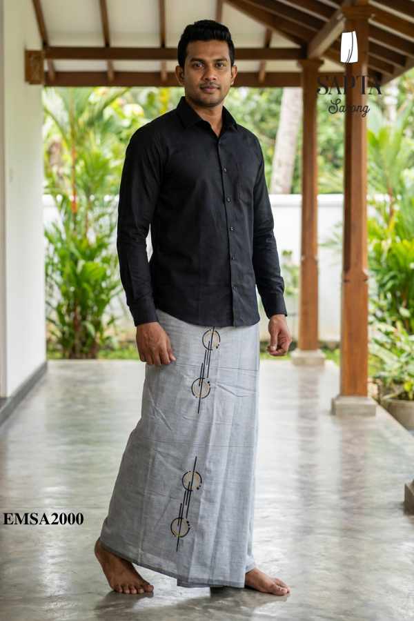 Elevate everyday ease with the Men\’s light gray sarong SAPTA EMSA2000, designed for barefoot comfort and a polished, confident look. This vertical stripe men\’s sarong features a clean, light gray base and a decorative stripe punctuated by three circular motifs in black and mustard gold, making it the definitive decorative stripe men\’s sarong SAPTA and mustard gold accent men\’s sarong. Soft, breathable drape falls to an ankle-length silhouette for effortless movement – an elegant gold motif men\’s sarong SAPTA and men\’s sarong with circular motifs that transitions from home rituals to resort evenings. Buy men\’s light gray sarong now, Order men\’s sarong with stripe today, and Buy ankle length men\’s sarong to claim a timeless classic with a light gray men\’s sarong stripe.