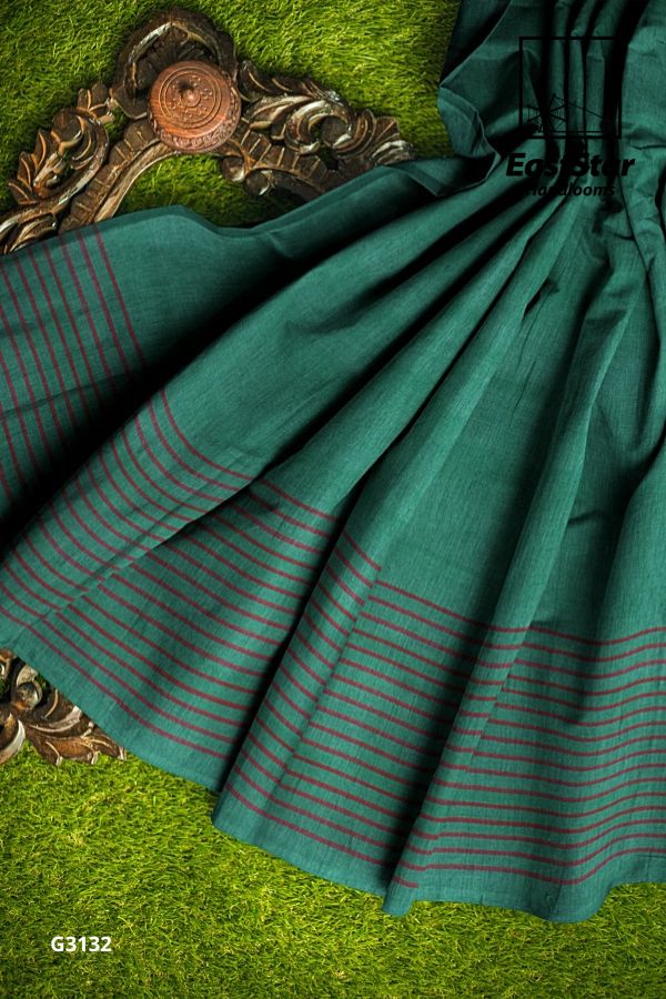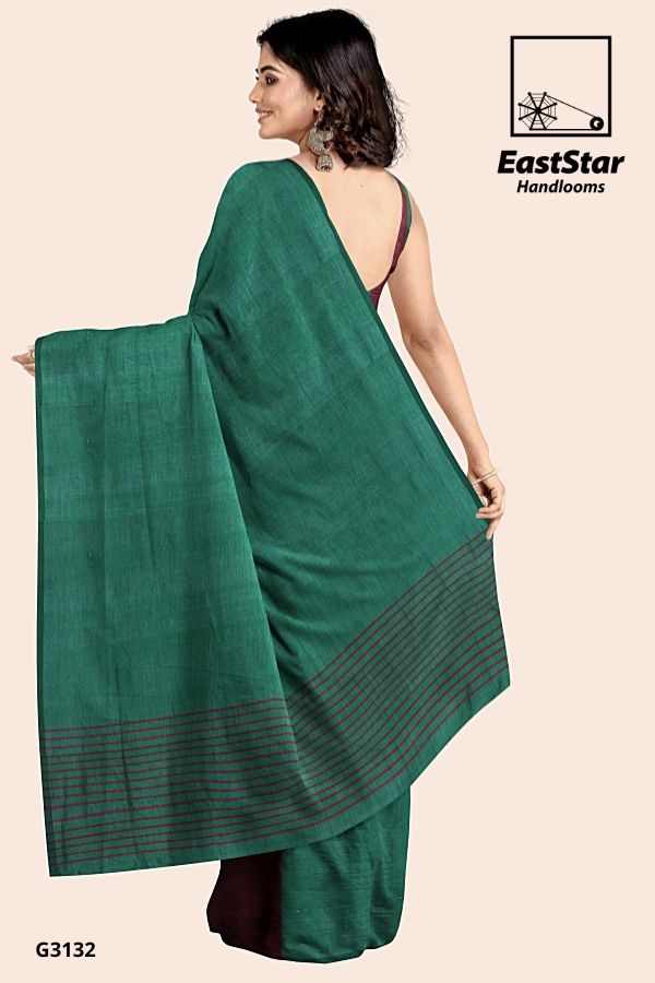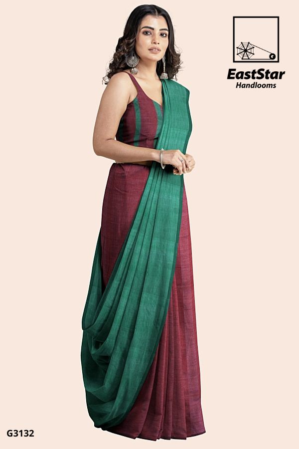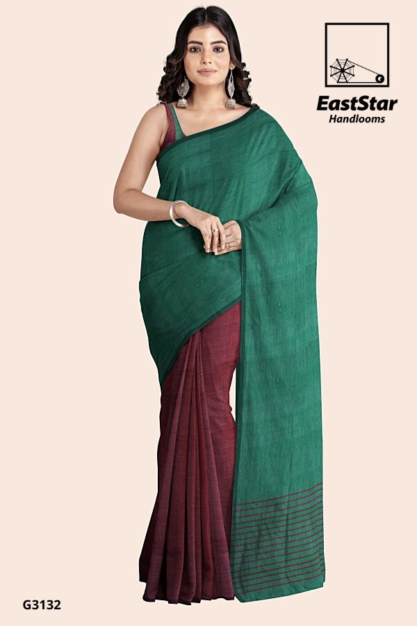 Elevate your elegance with our exquisite Traditional Green Maroon Saree. The rich green, adorning the upper torso and flowing pallu, seamlessly contrasts with the enchanting maroon pleats and lower section. The simplicity of the plain texture coupled with the understated green border with horizontal lines creates a timeless look. Paired with decorative earrings and a metal bangle, this saree is a perfect blend of tradition and sophistication. Embrace tradition and make a statement with this elegant green maroon saree. Order now and add this classic piece to your wardrobe.
