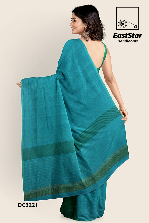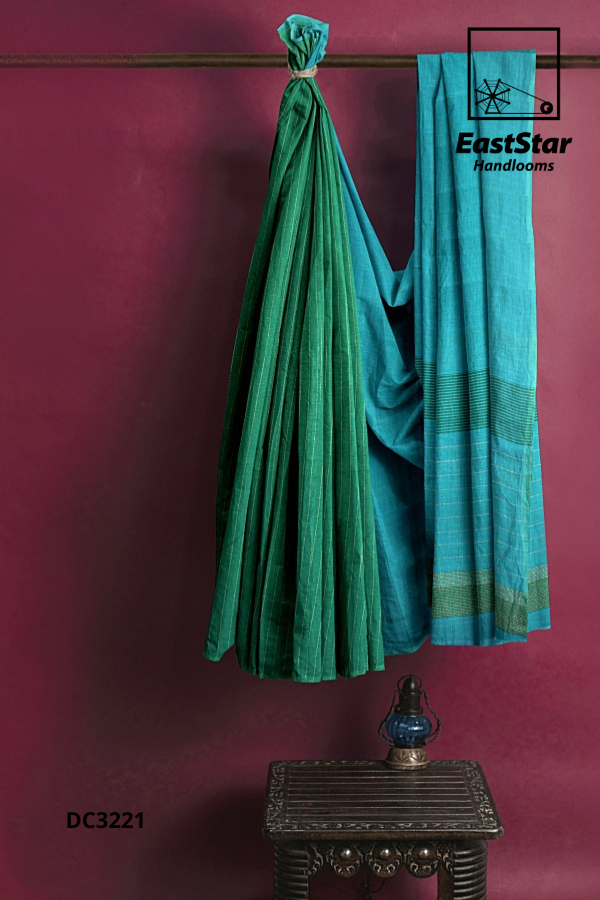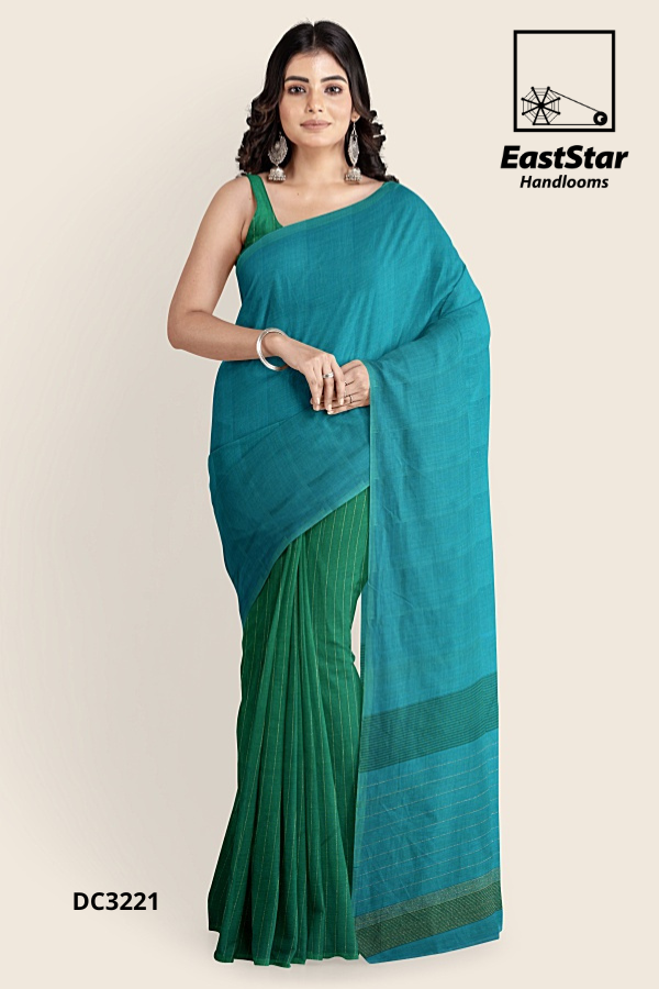 Unveil elegance redefined with the EastStar Handlooms two-toned sari, a masterpiece of color and craftsmanship. This exquisite piece features a captivating deep green base complemented by a flowing teal drape adorned with a subtle line pattern and darker border. The fine pleats in a slightly darker shade add dimension and grace. Paired with ornate silver earrings and a stylish silver bangle, this ensemble transforms tradition into a contemporary style statement. Whether you wish to buy a green teal stylish sari or add a touch of sophistication with ornate silver jewelry, explore this elegant collection and elevate your attire effortlessly.