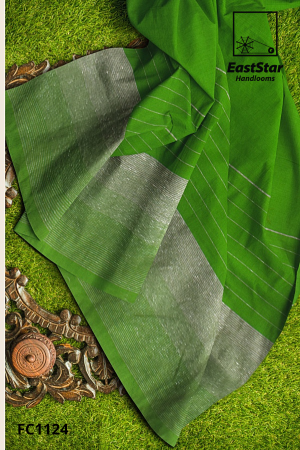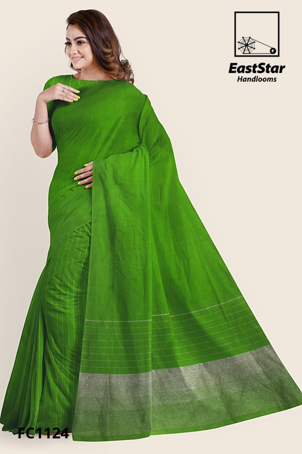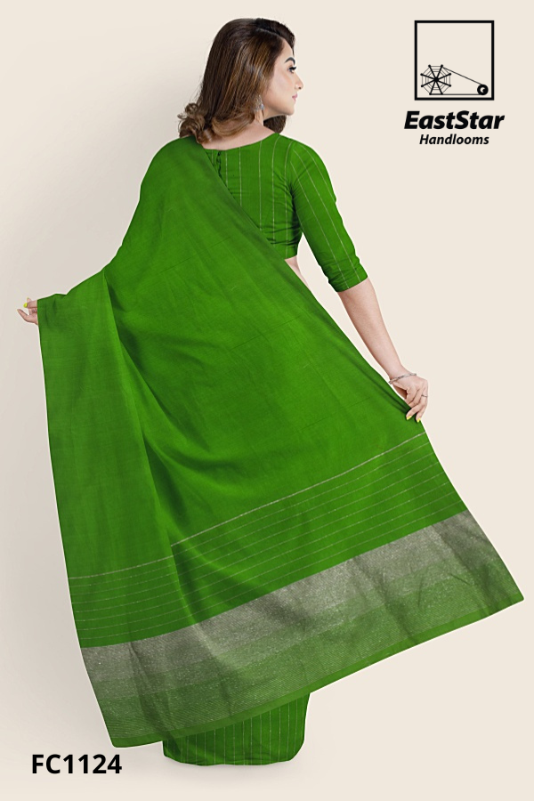 Meet FC1124 from EastStar Handlooms, a radiant bright green handloom saree that frames your glow with modern grace. A mostly solid green saree with stripes, it features delicate pinstripes—vertical on the pleats and blouse, horizontal across the pallu—finishing in a lustrous silver border pallu that adds a soft, silvery-gray sheen. The matching elbow-length blouse keeps the look polished and versatile, making this pinstriped green handloom saree effortless for celebrations, work events, or evening soirees. If you’re seeking the Green handloom saree EastStar Handlooms is known for, this bright green pinstriped saree EastStar Handlooms is the one—buy bright green handloom saree FC1124 now, order green saree silver pallu today, and buy pinstriped green handloom saree to step into every room with quiet confidence.