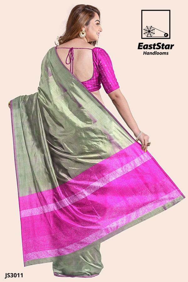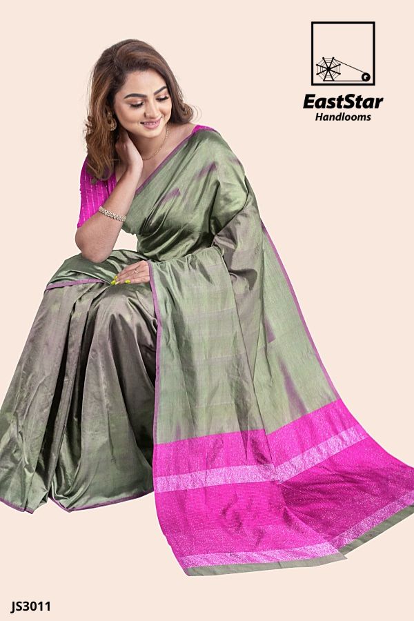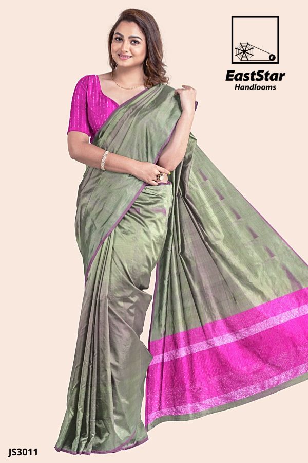 Step into elegance and tradition with this stunning Green Saree adorned with a gorgeous Purple border and vibrant Pink stripe at the bottom. Paired with a magenta blouse that perfectly enhances the saree\’s beauty, this attire promises to be a showstopper at any event. Perfect for formal occasions, this handwoven traditional Indian saree is crafted for those who appreciate exquisite craftsmanship and timeless beauty. Order now to add a touch of premium elegance to your wardrobe!