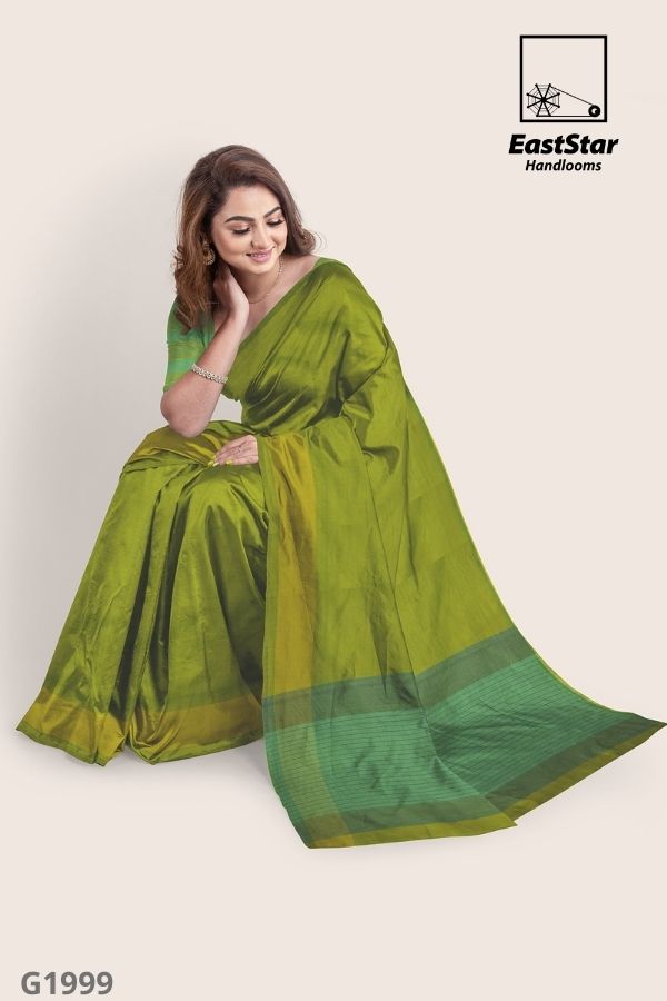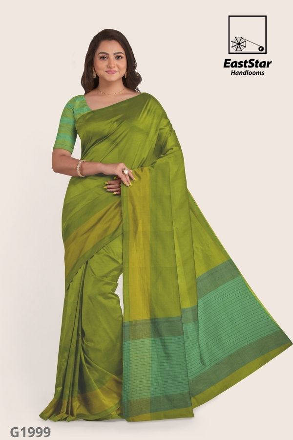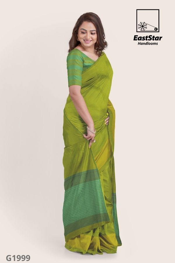 If you are looking for a fine outfit for work, this is another stunning piece! The East Star handloom Glossy cotton saree is woven with Love, but intricate motifs all over the body. This Green Yellow color of the saree completes the look. Wear it with handmade Jewelry and sandals to ace the perfect board room look. Green blouse is as it\’s Shown in the Picture.