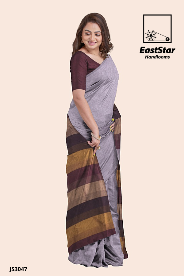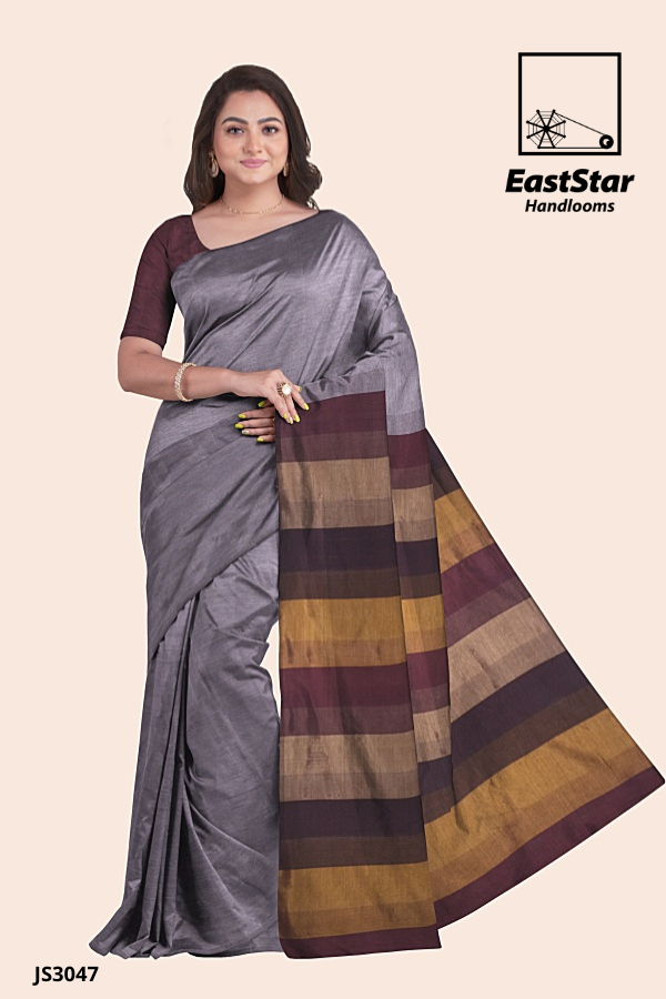 Experience the elegance of Indian tradition with our exquisite Traditional Gray Indian Saree. This saree showcases a serene gray hue with a stunning pallu adorned in broad maroon, mustard, and brown stripes, eloquently paired with a chic maroon blouse. Perfect for any special occasion, its simple yet refined design speaks volumes of timeless sophistication. Complete your look with its exquisite combination of traditional craftsmanship and modern style, making it a must-have ensemble in your collection. Embellish your persona with the perfect blend of grace and class. Order your traditional Indian gray saree online now and embrace the legacy of Indian elegance.