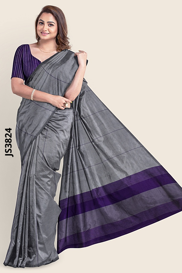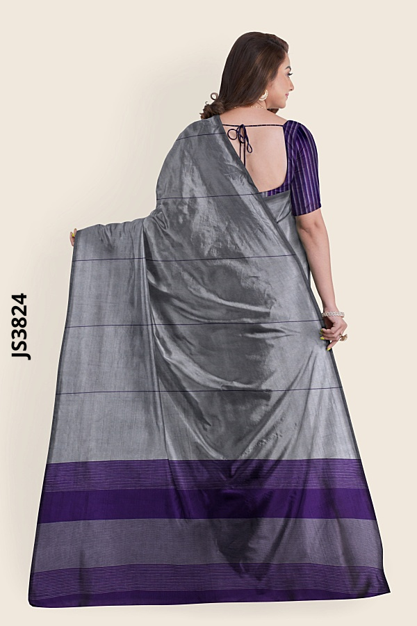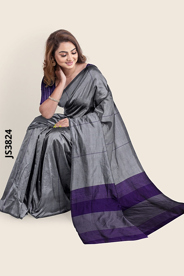 Elevate your occasion wardrobe with Elegant Grey Sari JS3824— a shiny grey sari with fine pinstripes and a lustrous, fluid drape. The refined grey saree with purple border showcases two broad purple stripes edged with delicate pinstripes, paired with a deep‑purple, wide‑neck blouse for a modern, polished finish. Graceful front pleats and an easy, camera‑ready pallu make this shiny grey pinstripe saree JS3824 as flattering as it is versatile — from weekday chic to elegant grey saree party wear. Buy grey saree purple border and buy elegant grey striped saree now: the definitive Grey purple border saree JS3824. Order shiny grey sari today and step out in timeless poise.