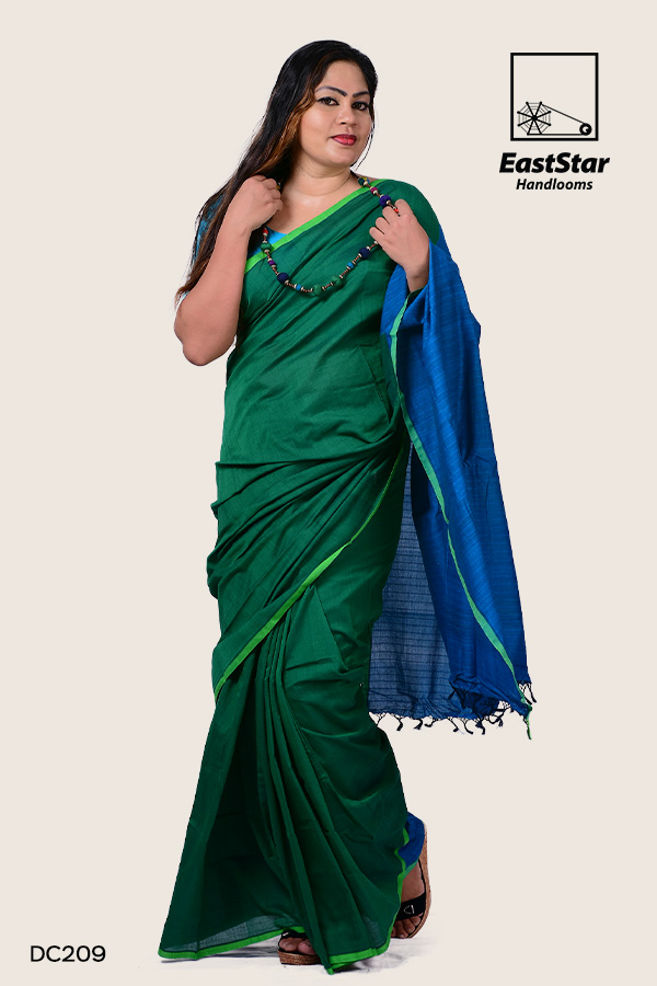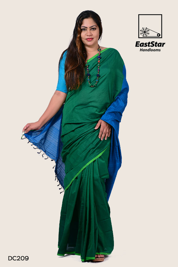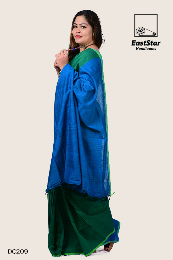 The Combination of Green & Blue seems to be gaining popularity in the present times. You can create this ethereal look by wearing your Handloom cotton saree with Blue cotton blouse. . Wear statement Handmade earrings with necklace and get ready to earn tons of compliments from your loves one!